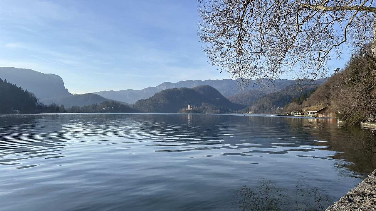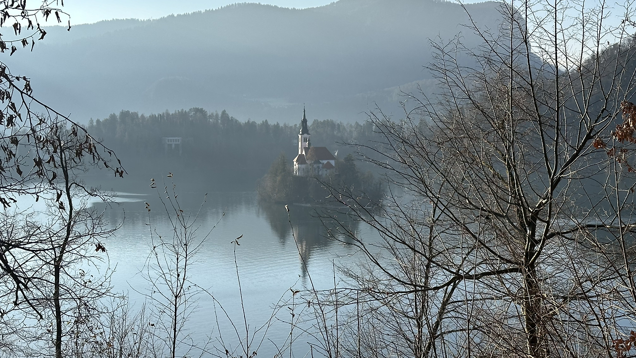 산길을 오르는 것은 꽤 많은 체력을 요해서 한 겨울 날씨에도 땀을 흠뻑 쏟았다. 그래도 중간중간에 보이는 블레드 호수와 멀리 보이는 설산의 풍경이 아주 좋았다. 이런 풍경은 정작 블레드 성 근처로 가면 볼 수 없다.