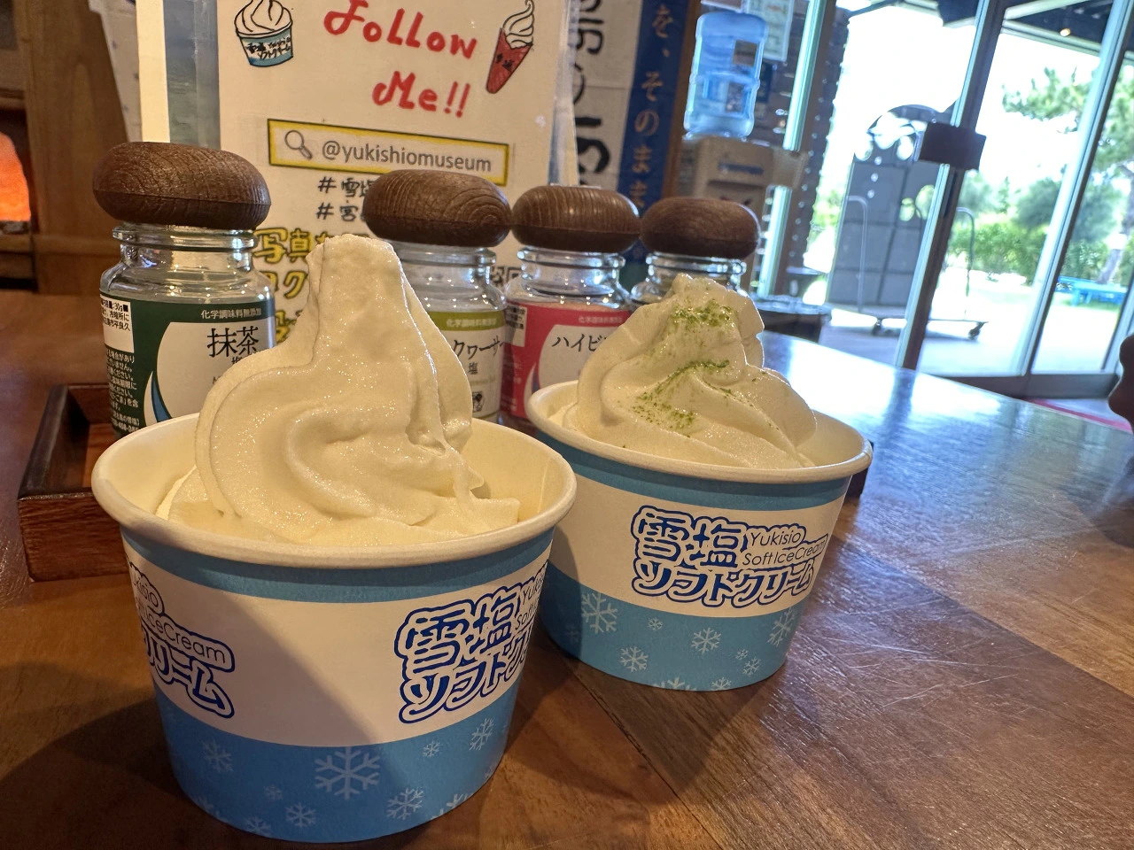 유키시오는 미야코지마에서 꽤 유명해서 기념품 상점이 아니라 슈퍼에 가도 쉽게 구할 수 있는데 일본의 다른 지역에서는 볼 수 없었다. 이곳에서는 소금을 활용한 다양한 제품을 판매하고 있었는데 특히 아이스크림이 유명하다. 아이스크림을 그냥 먹는 것이 아니라 소금을 뿌려 먹는데 테이블에 여러 종류의 소금이 놓여 있어서 자유롭게 여러 가지 소금을 맛볼 수 있다. 아이스크림의 달콤함과 소금의 짠맛이 말 그대로 단짠단짠이다.