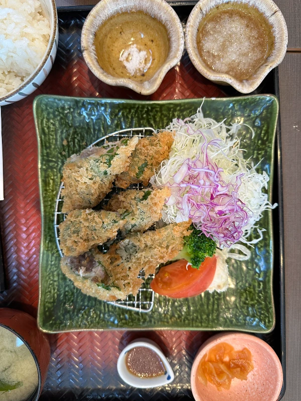 오변은 '전갱이 튀김 정식'을 시켰다. 생선살만 채소에 말아 바삭하게 튀겼는데 간무에 폰즈와 곁들이니 생선과 같이 튀긴 시소잎 향이 나서 깔끔하니 좋았다.