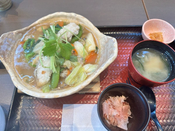 나는 '바지락과 흰살생선 질냄비 탕수 소스 밥'을 주문했다. 녹말소스에 튀긴 생선과 볶은 채소, 밥이 들어가 있어 해물 누룽지탕의 느낌이 났다. 가쓰오부시와 참나물 향이 좋아 뜨끈하고 대파가 많이 들어서 몸이 뜨끈해져 보양식 느낌이 난다.