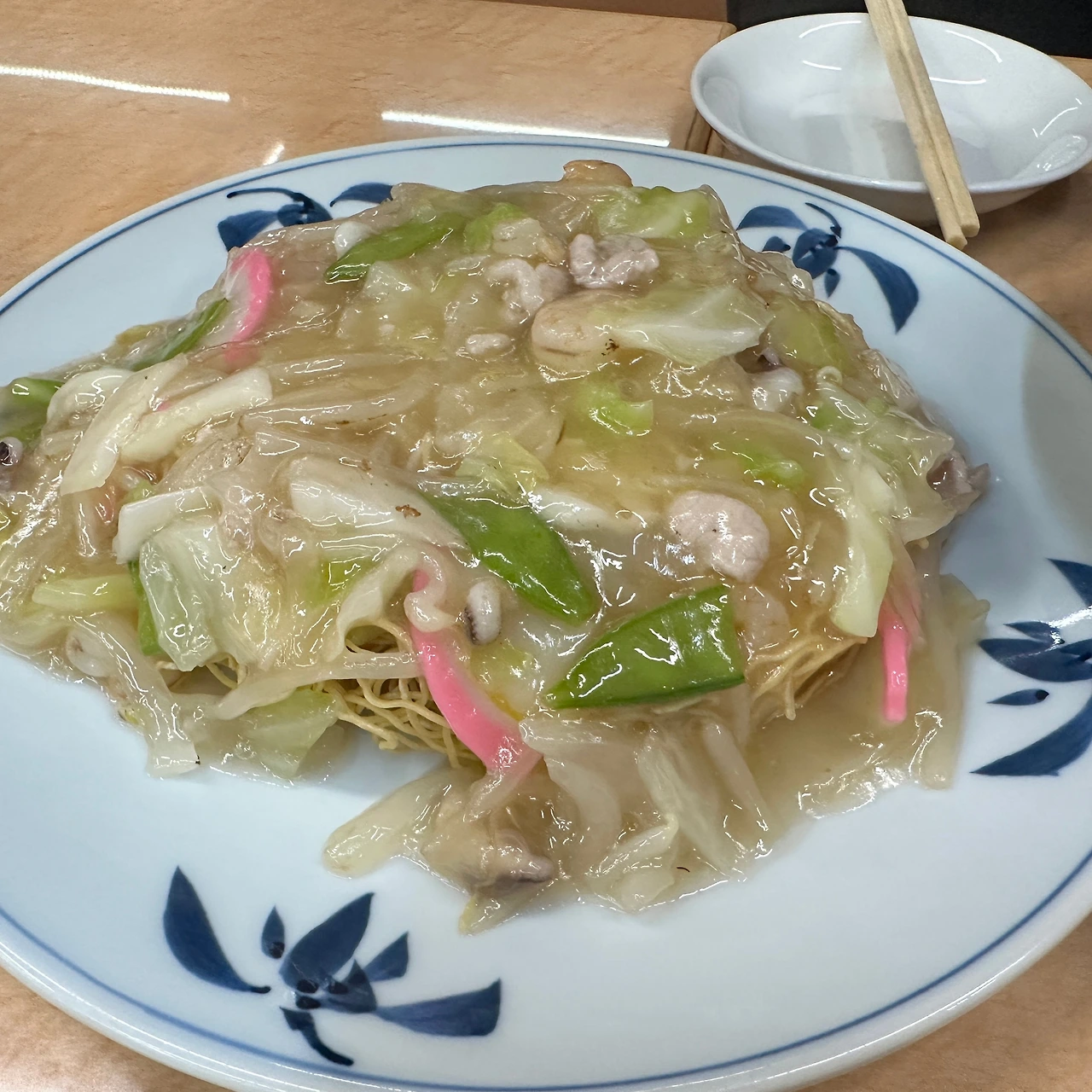 접시우동은 처음 본 메뉴인데 굉장히 독특했다. 메뉴명과 다르게 얇은 면이 나오는데 튀긴 면과 구운 면중에서 선택할 수 있다. 우리는 튀긴 면으로 시켰는데 바삭하게 튀긴 얇은 면에 탕수육 같이 걸쭉한 소스를 뿌려 나온다. 바삭바삭한 면에 걸쭉한 소스가 조화로운 식감을 만들어 재미있다. 이 메뉴에 킥 포인트는 우스터소스인데 테이블마다 놓인 소스를 살짝 뿌려 먹으면 새콤한 소스 맛이 접시우동의 감칠맛을 살려준다.