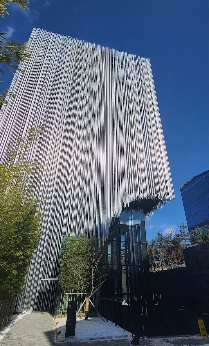 마치 거대한 파이프 오르간을 보는듯한 건물 안으로 들어서면 도슨트 시작 10분 전부터 발권이 가능하다는 안내와 함께 대기 공간으로 유도한다. 대기 공간에서는 건물을 설계한 쿠마 켄고와 건물 내 사이니지를 디자인한 히라 켄야의 인터뷰 영상이 재생 중이다.