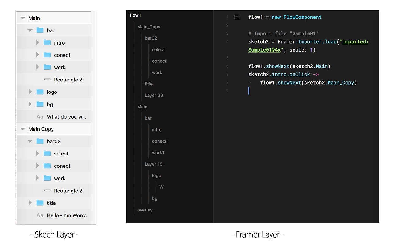 sketch2 = Framer.Importer.load("imported/Sample01@4x", scale: 1) [스케치 파일 불러옴]