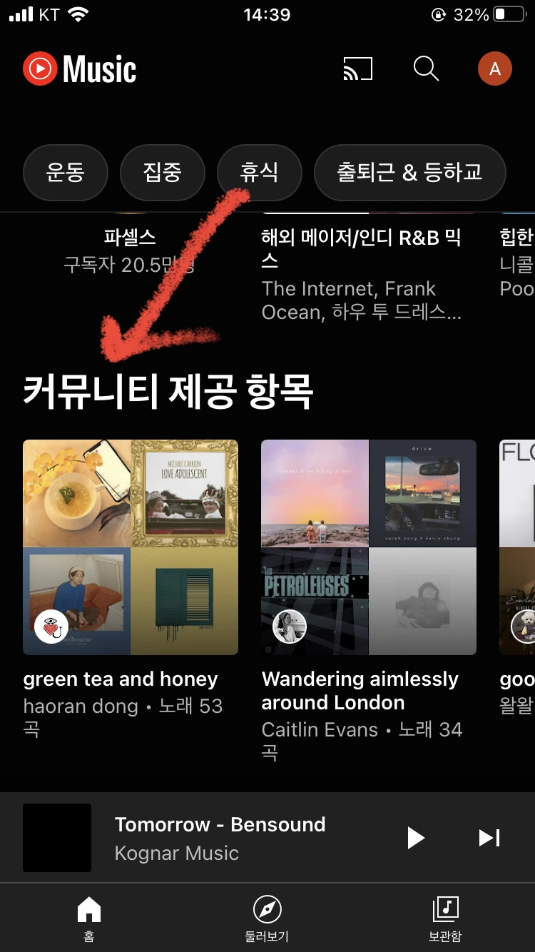 홈화면에 나열된 콘텐츠 리스트의 스크롤을 내리다 보면 커뮤니티 제공 항목이라는 것을 볼 수 있다. 이는 사용자들이 자신의 취향이 가득담긴 음악 리스트를 공유한 것이다. 다른 음악 스트리밍 서비스의 경우 서비스 자체의 기술을 활용하여 사용자의 취향을 분석하여 음악을 큐레이션 해주고 있다. 유튜브 뮤직도 마찬가지로 서비스 자체에서 취향에 맞는 큐레이션 콘텐츠를 제공하고 있으나, 하지만 한 가지 다른 점은 이 외에도 (물론 여기에서도 알고리즘, AI같은 기술이 활용되었겠지만) 실제 사용자들의 재생 목록을 공유하여 음악으로서 나와 비슷한 취향을 가진 '사람'을 소개해주고 있다. 이는 재생 목록을 통해 서로의 취향을 확인하고, 공감대를 형성하면서 음악으로 사람과 사람 사이의 감정적인 상호작용을 불러일으킬 수 있도록 유도하고 있는 것이다.