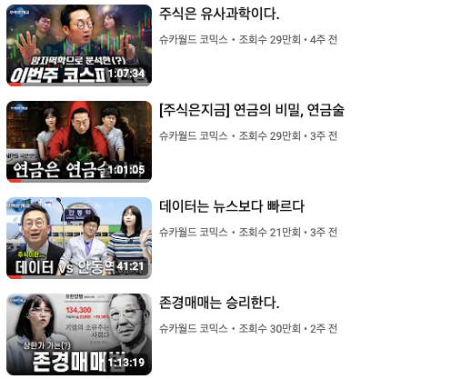 언젠가 주식 라이브 방송을 마무리하며 '너무 주식 생각만 하기 보다는 오늘 하루도 사랑하는 사람들과 행복한 시간을 보내시면 좋겠다'고 했던 슈카 님의 멘트가 기억에 많이 남습니다. 슈카월드 채널과 함께 우리나라 경제도 개인 투자자도 건강하게 성장할 수 있기를 기원합니다.
