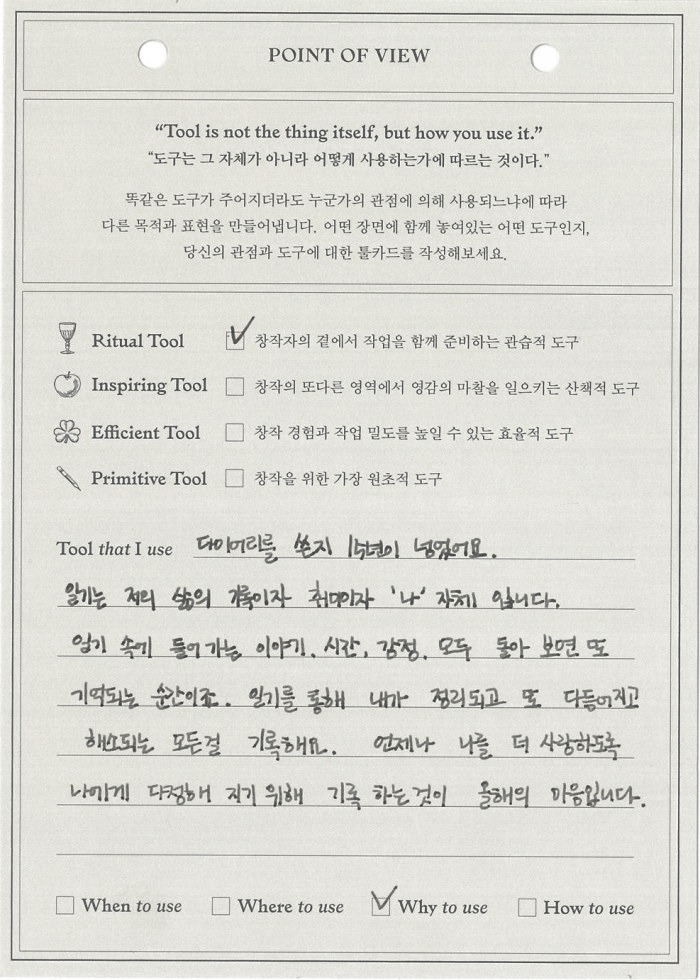 예전에 성수동 매장을 구경하다가 노트 제품에 관해 고객이 직접 작성한 큐레이션 카드를 보고 깊은 인상을 받았었어요. 특별한 예술가가 아니어도 창작은 누구나 할 수 있고, 포인트오브뷰의 도구가 그 시작을 도와줄 것이라는 메시지를 말하고 있는 것 같았거든요.