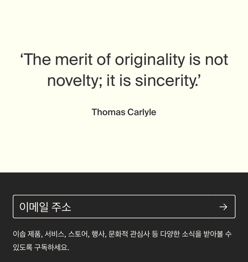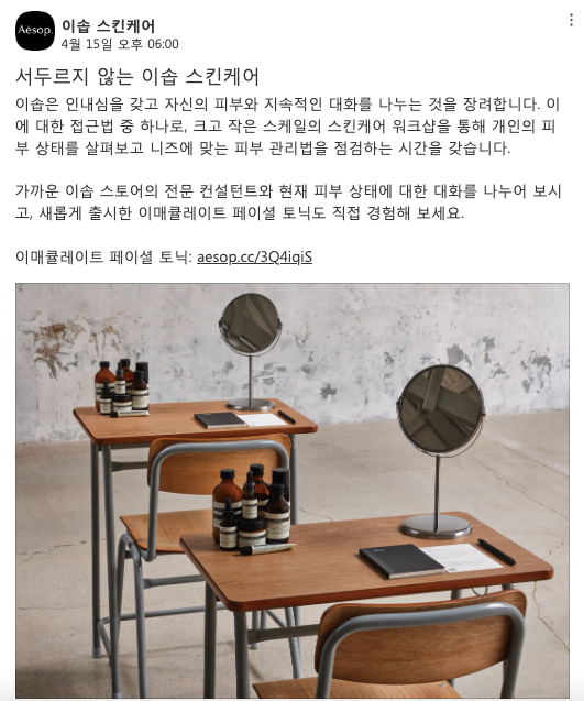 이런 언어가 코스메틱 브랜드에서 쓰기에는 너무 철학적이고 무겁다고 느껴질 수도 있습니다. 하지만 이솝이 건강한 삶과 피부의 균형을 위해 화장품을 만드는, 본질에 집착하는 브랜드라는 점을 생각하면 브랜드 철학을 언어에 잘 반영하고 있다고 볼 수 있습니다.
