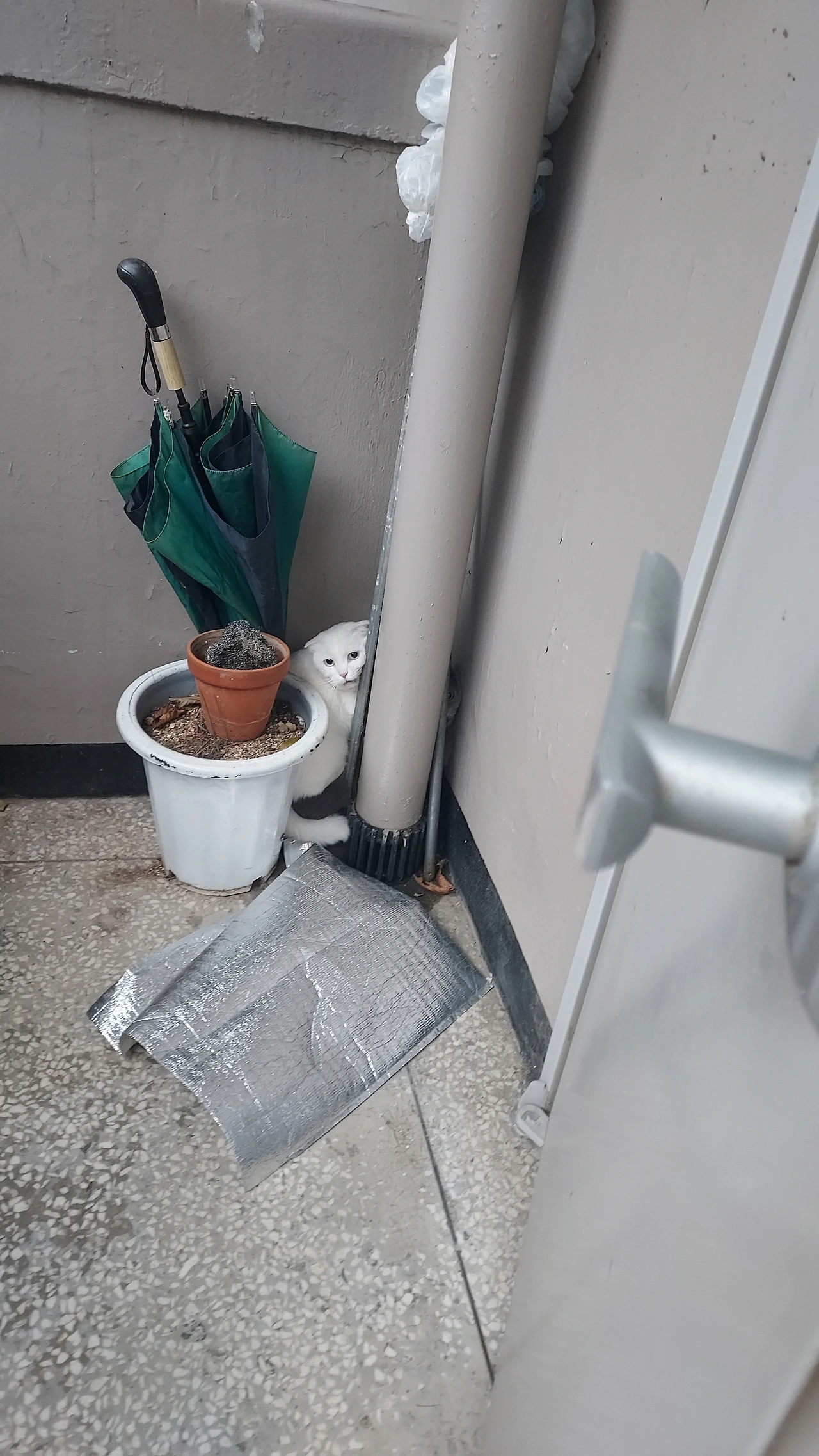 문을 살짝 열고 고개를 내밀었다. 이미 관리 사무소 직원 두 명이 와 있었다. 고양이는 배수관과 화분 틈 사이에 다 보이게 몸을 숨기고 있었다. 누가 봐도 집고양이라는 걸 알 수 있을 만큼 귀태가 났다. 하얀 고양이는 겁에 질린 눈망울로 사람들을 뚫어지게 바라봤다. 자세히 보니 두 마리였다. 회색 고양이는 하얀색 고양이에 깔려서 한쪽 눈만 드러낸 채 우리를 한 번만 구해달라는 표정으로 바라보고 있었다.