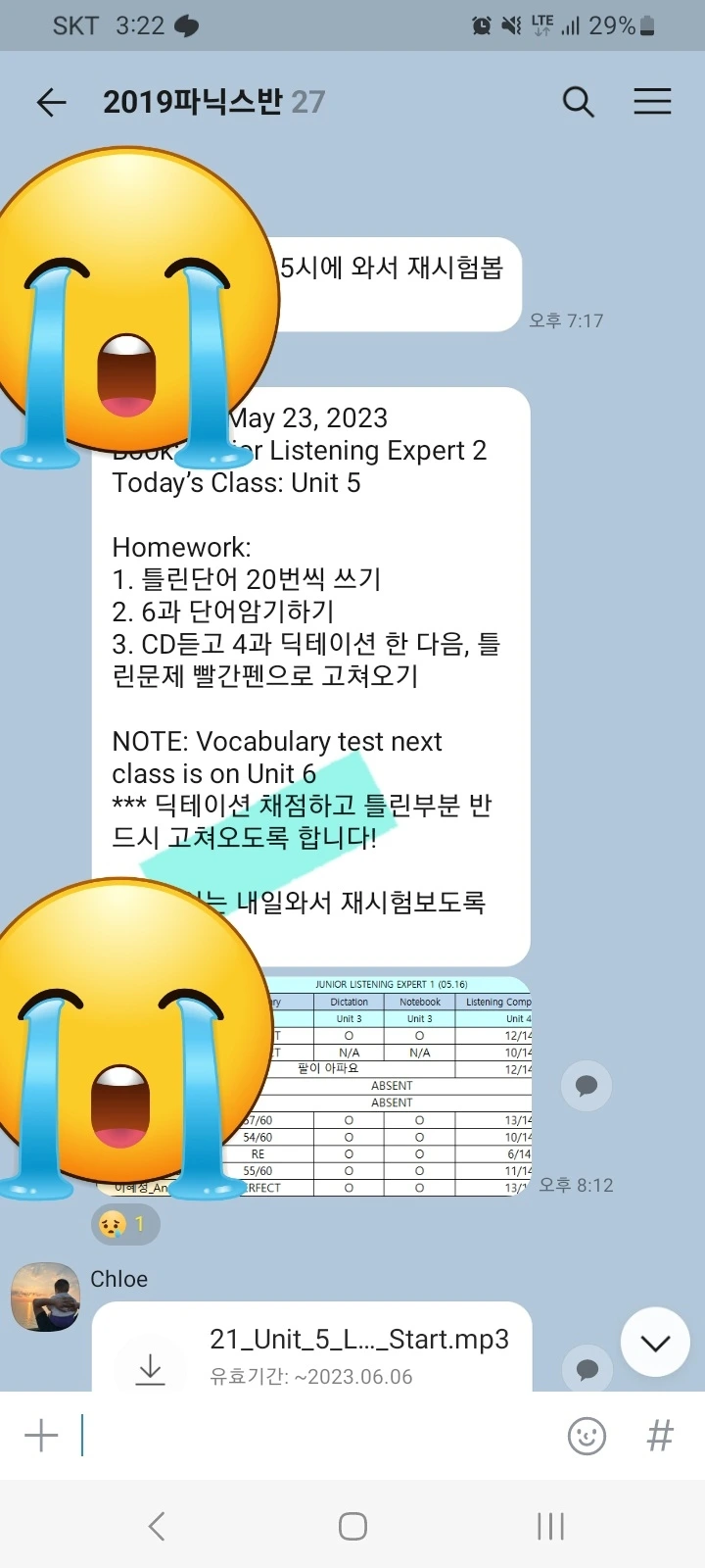 "너희 아빠 또 오열하겠다.” 요즘 영어 학원 선생님과 친구들이 딸을 놀리며 하는 말이란다. 딸은 창피하지도 않은지 피식 웃으며 집사람과 내게 조잘댔다. 올해 초, 아내는 나를 영어 학원 카톡방에 반강제로 가뒀다. 딸을 심하게 나무라는 아내에게 한마디 했더니, 아내는 얼마나 답답한지 느껴 보라고 했다.