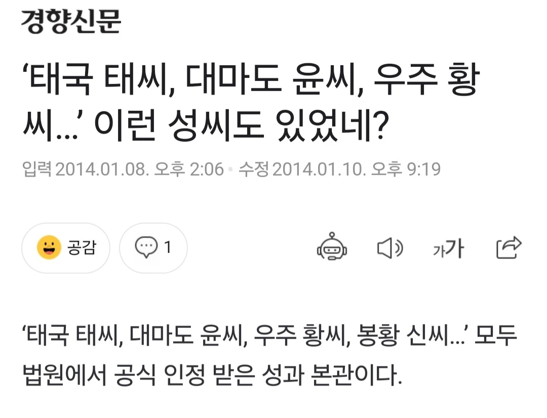 우주 황씨는 시조 황민보가 태어난 전라북도 완주의 옛 지명인 우주(紆州)를 본관으로 한다. 별들이 반짝이는 우주(宇宙)와는 전혀 다른 의미다. 오래전 경향신문에는 '태국 태씨, 대마도 윤씨, 우주 황씨... 이런 성씨도 있었네?'라는 제목의 기사가 실렸다. 아마 기자도 동음어 때문에 오해했던 것 같다. 내 본관을 말하면 다들 비슷한 반응을 보인다. 그래서 꼭 부연해서 설명해야 한다. 우주 황씨는 약 2만 5천 명이다. 그래서 같은 본관을 만나면 더 반갑다. 외국에서 같은 아파트 사람을 마주친 기분이랄까! 그래서 아버지나 내 항렬(같은 대수의 혈족끼리 공유하는 이름자)의 이름을 보게 되면 본관을 물어보곤 한다. 아쉽게도 이렇게 해서 일가를 만난 적은 없다.
