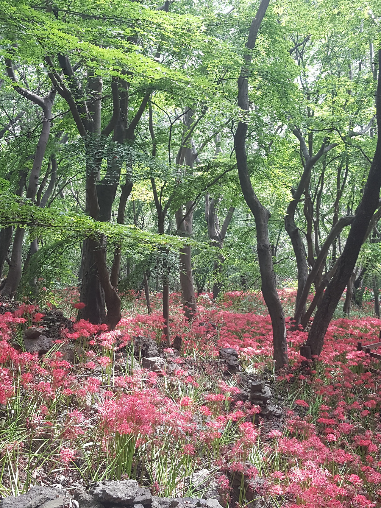 꽃무릇은 가지가지 형상의 바위와 녹음이 가득한 연륜 있는 도토리나무들과 조화를 이루어 그 곱기가 한층 돋보였던 것이다.