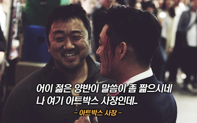 이런 느낌을 또 받았던 건 바로 우리의 아트박스 사장, 마동석의 등장이었다. 영화의 클라이맥스, 서도철을 쓰러뜨리고 빠져나가려는 조태오를 가로막는 사람이 하필 마동석이라니. 그것도 그 덩치에 안 어울리게도 ‘아트박스 사장’이라고 소개하다니. 스마트폰으로 촬영이나 해대는 군중 사이에서 그는 정말로 사고 칠 거 같은 모습으로 악당 앞에 나선다. 뜬금없지만 분명히 구세주적 역할을 할 것만 같다. 그러나 서도철이 일어나서 조태오를 상대할 수 있게 되자 그는 바로 사라진다. 이 일련의 과정, 배우로서 이미지가 확고한 마동석이 전혀 어울리지 않는 직업을 가졌고 무언가 일을 만들 것 같지만 그저 시간을 끄는 행인 1이라는 점. 무척 코미디적이기도 하지만 반대로 어딘가 석연치 않았다. 이 영화의 전체적인 코미디와는 다르게 영화 외적인 부분에 기대고 있는 것이었다. 때문에 이 부분도 역시 “영화”임을 강조하는 감독의 의도라고 느꼈다.
