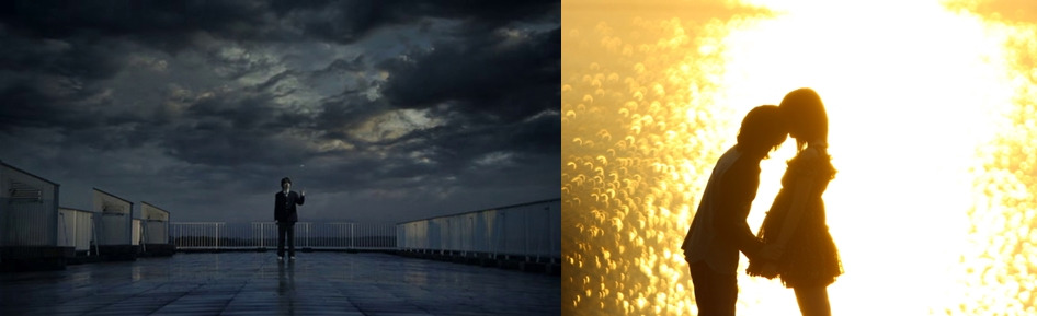 반대로 <고백>은 시간을 보다 부각한다. 무채색, 회색 톤의 영상을 기본 골자로 고속 촬영과 이와 대비되는 홈비디오 풍의 저속 촬영을 끊임없이 인서트로 사용한다. 이런 무채색의 연속에서 해 질 녘 같은 자연광은 보다 부각되고, 연출에서도 필요에 따라 스포트라이트를 사용해 시간대와 인물을 두드러지게 하는 편이다.