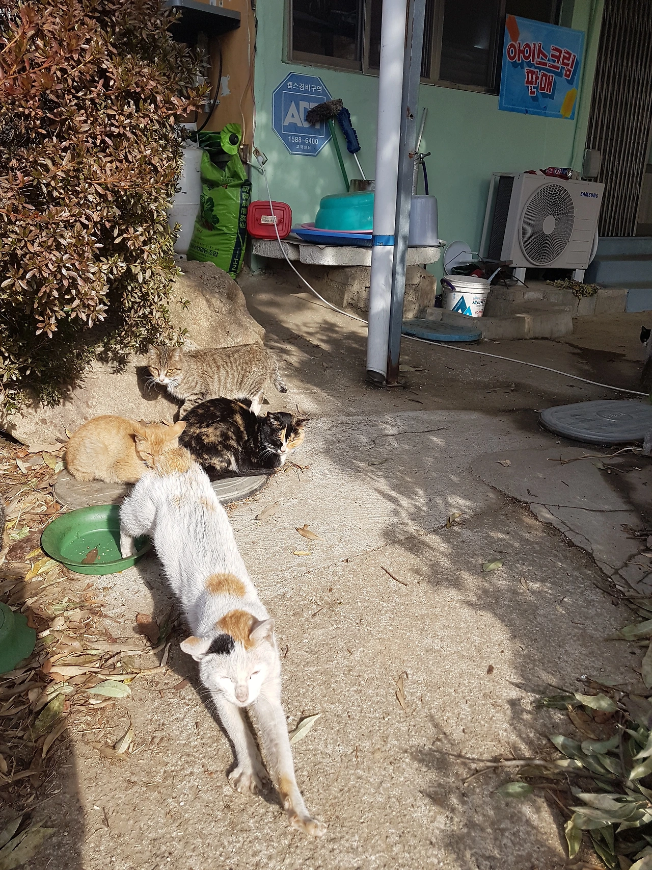 그 와중에 경로당 앞에 고양이 무리가 단체로 모여있었다. 시골스러운 플라스틱 밥그릇이 인상적인 건 정말 큰 크기 때문이기도 했다. 그래도 저 정도 고양이를 먹이려면 별수가 없었겠다 싶다. 아직은 초딩 정도로 보이는 고양이 무리는 할머니들이 주시는 밥을 먹고 자란 것이 틀림없다. 특히나 이 마을을 출장 가면서는 유독 고양이들을 많이 봐왔다.