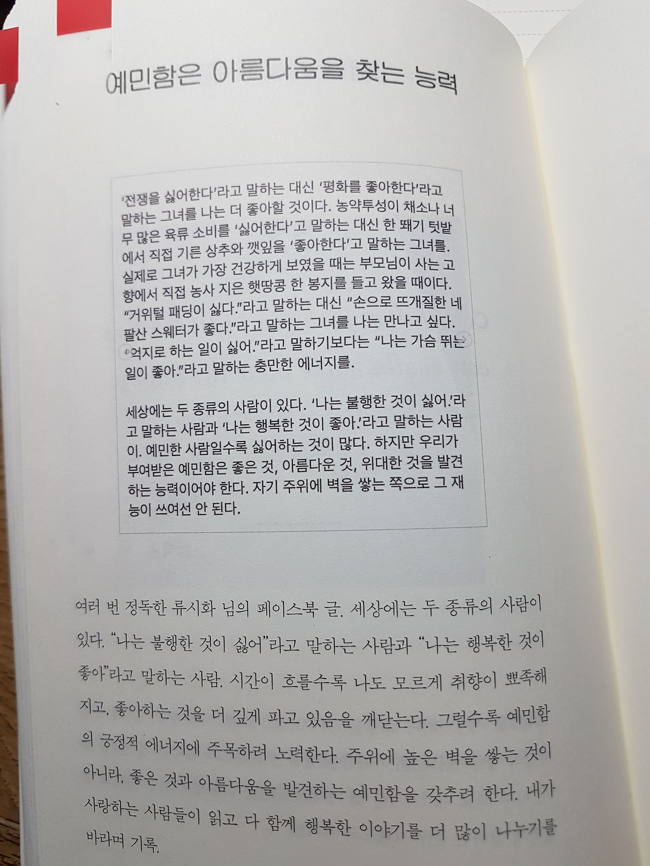그중에서 가장 마음에 와닿았던 글은 류시화 님이 페이스북에 올렸다는 글을 담은 페이지였다. ‘예민함은 아름다움을 찾는 능력’이라는 제목인데, 부정적인 단어를 즐겨 쓰는 예민한 성격인 내가 배울 글이었다.