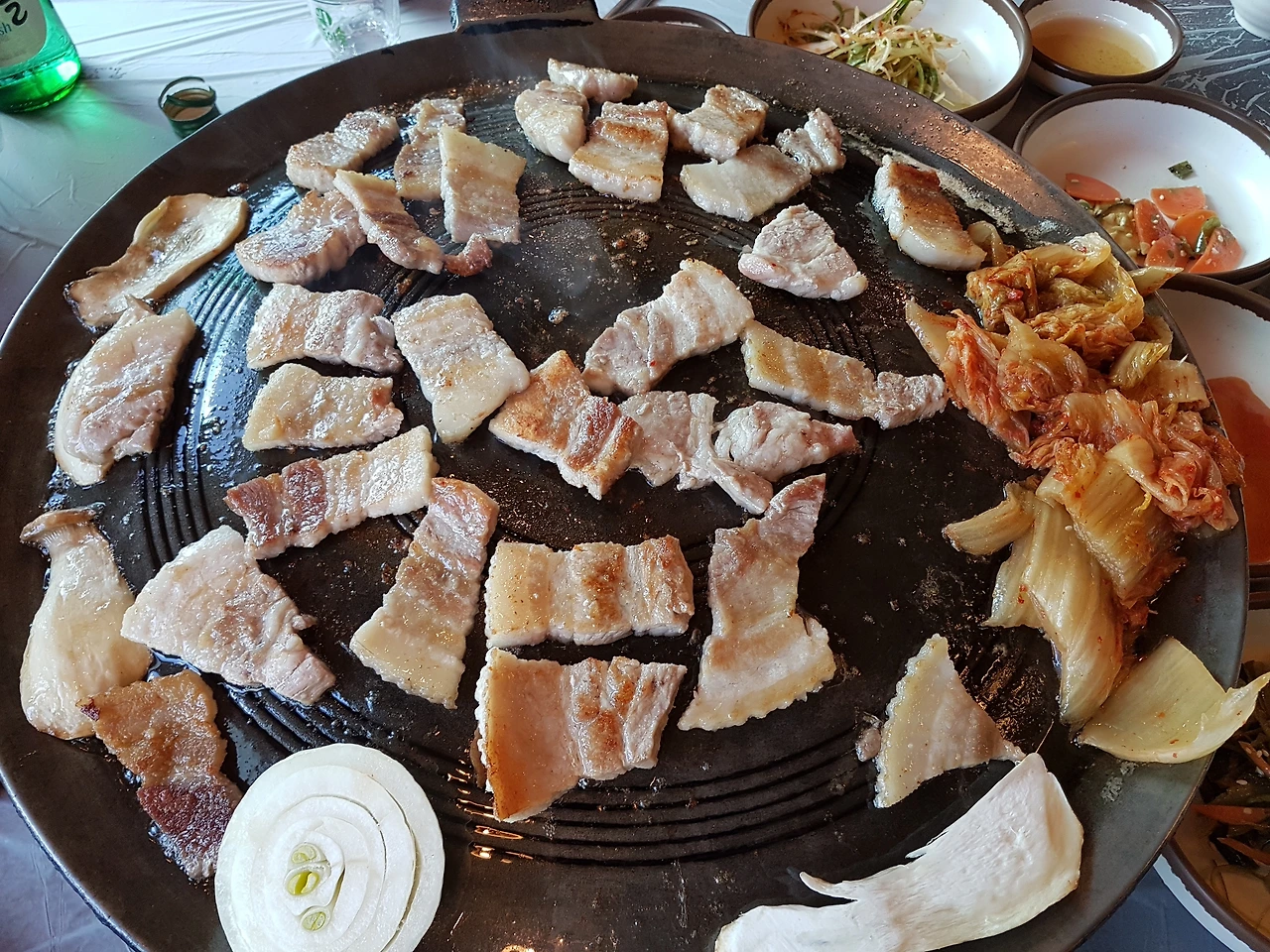 솥뚜껑 모양에 불판에 삼겹살을 올려두고, 기름이 내려가는 곳에 묵은지와 버섯, 양파가 자리했다. 생삼겹살이 불판에 눌어붙지 않게 보다 보면 기름 먹은 묵은지가 볶음 김치 맛을 내고 있었다.