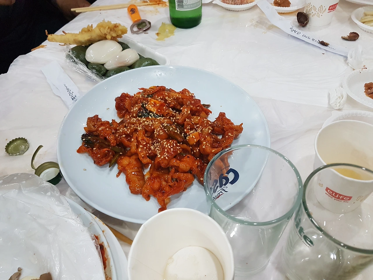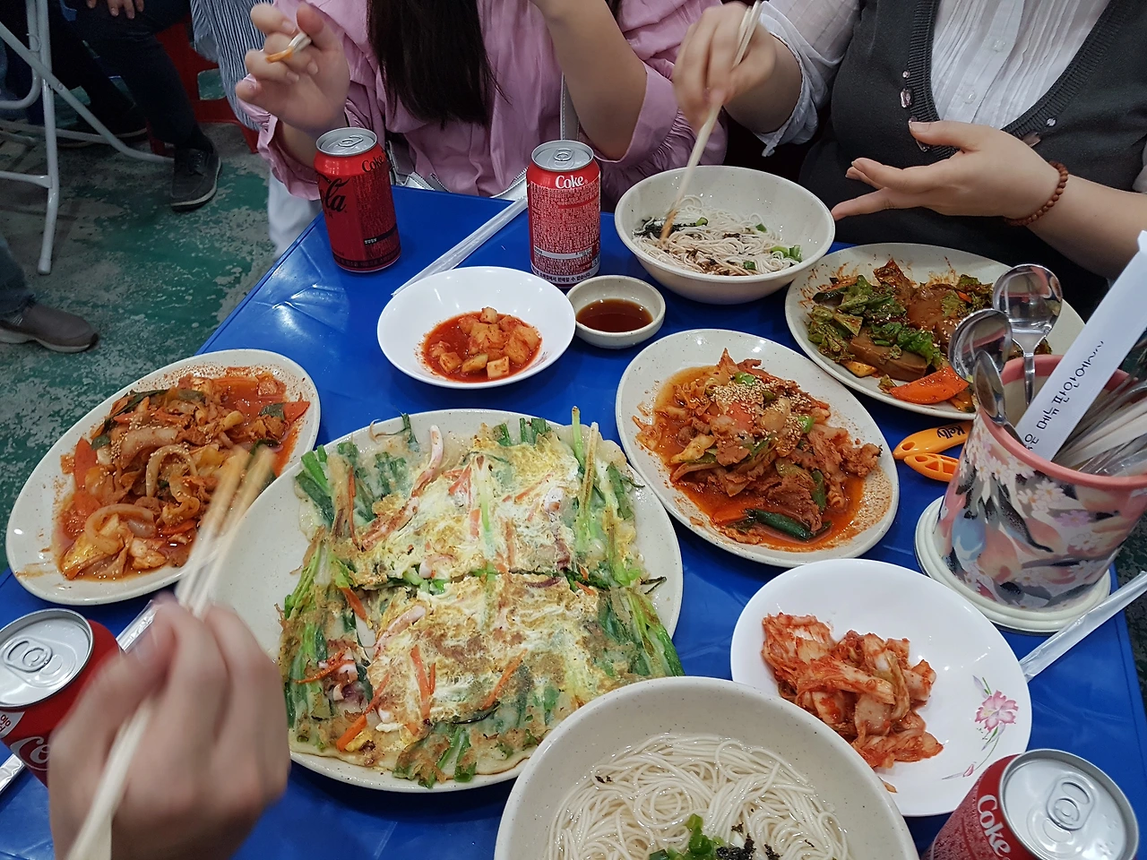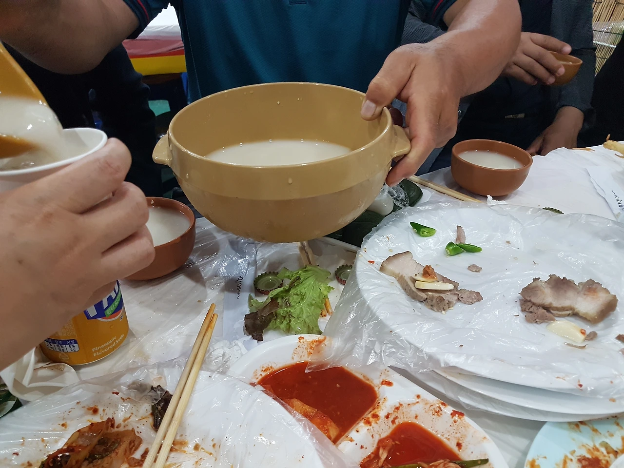 그리고 불금에 다시금 고생한 직원들과 인근 면에서 열었다는 주막에서 술 없는 조촐한 먹방을 찍었다. 앉을 곳이 부족해서 두 명이 앉으면 편할 자리에 네 명이 앉아서 술 없이 먹는 안주를 먹었다. 아마도 이런 것은 복직을 하고 처음이 아녔을까 싶다. 보통은 편안한 사람과 한 끼 먹기는 하지만, 멤버 조합도 참 새로운 구성이었다. 아마도 축제이기에 가능한 자리였을 것이다.