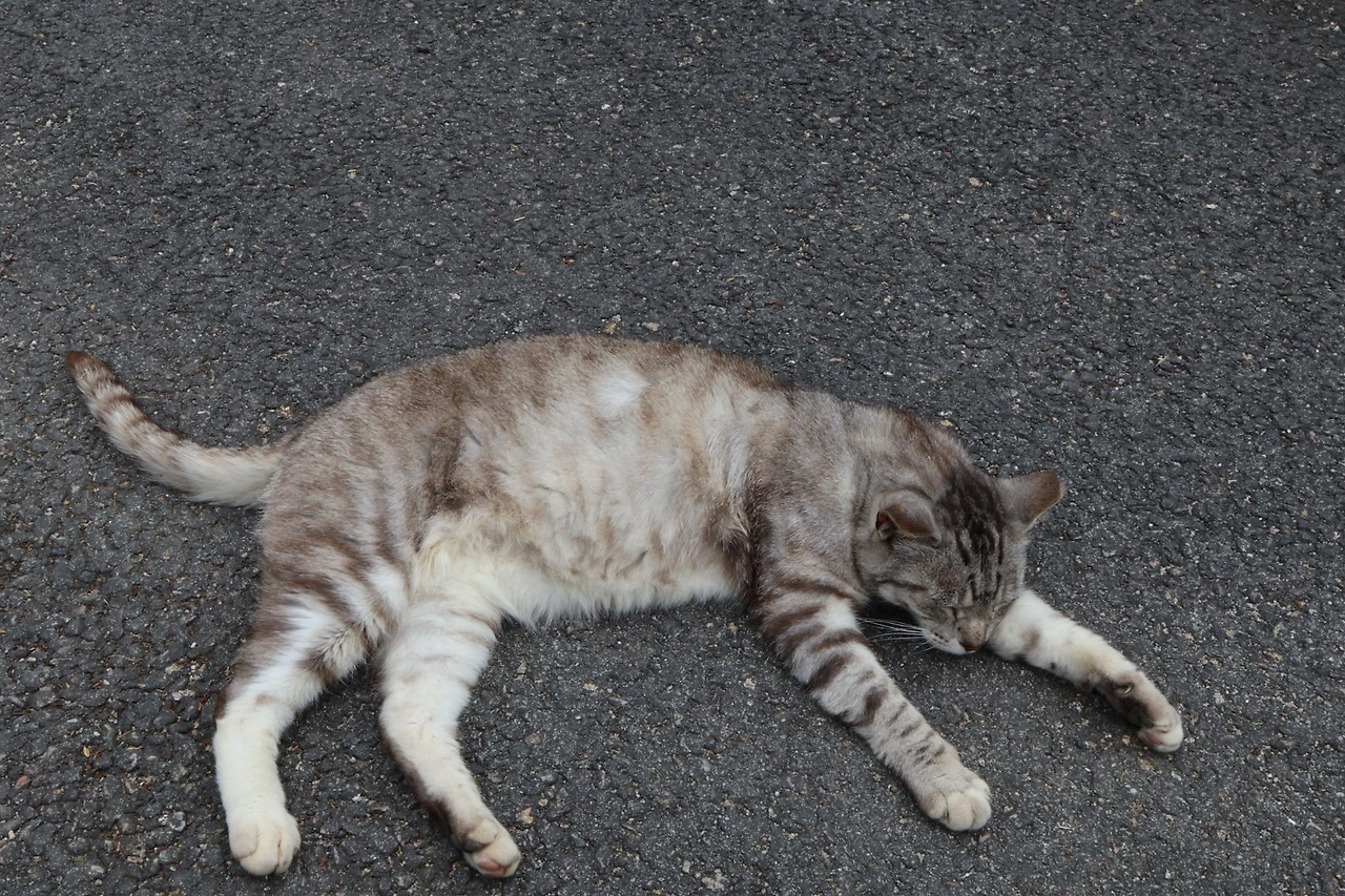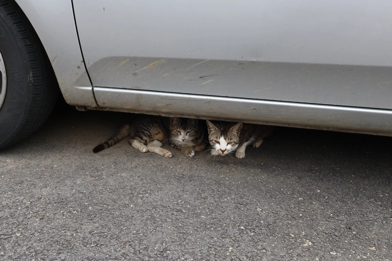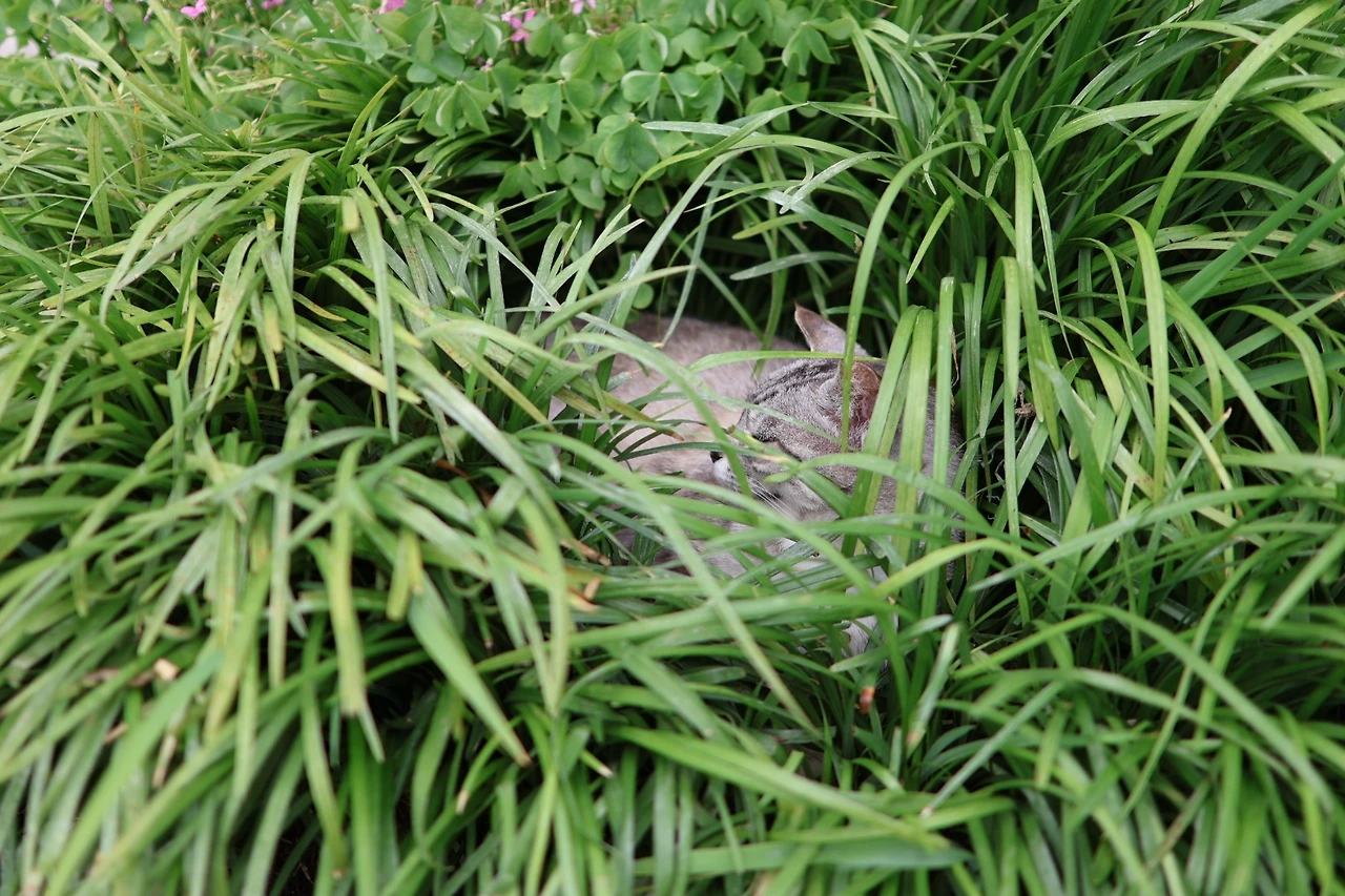 둘러보니 몇 마리는 차 밑에 숨어 있고, 내가 애착 있게 보는 물음표 고양이는 높게 자란 풀 숲에서 꼭 숨어 있었다.
