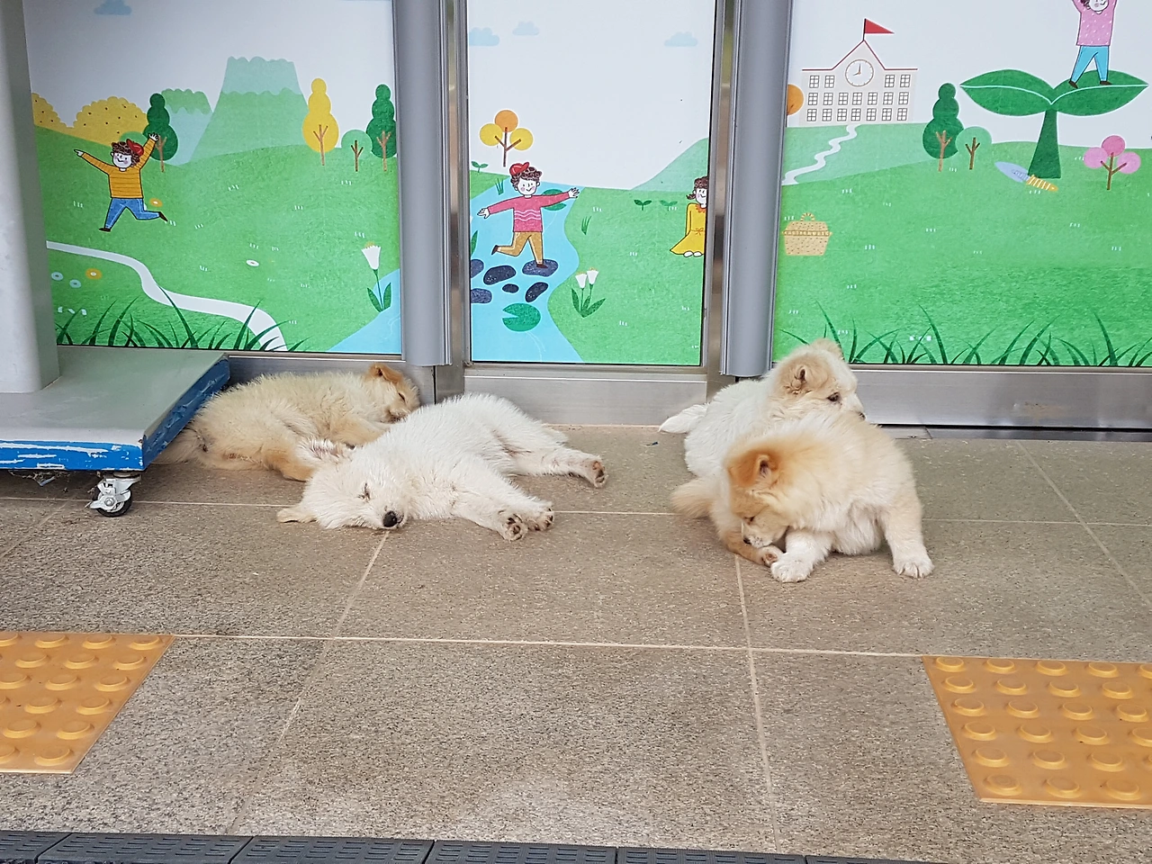 그리고 어느 날은 초등학교에서 난감한 문의를 했다. 학교 입구에 난데없이 강아지들이 자리를 차지하고 있다면서 말이다.
