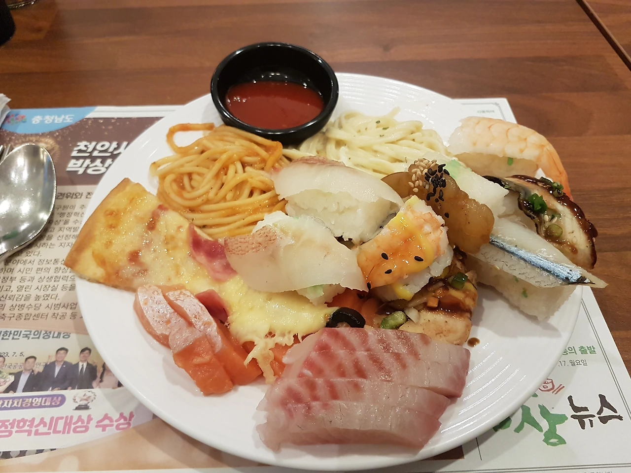 왜 이렇게 빈 접시에는 뭔가를 채우고 싶은지? 빈 그릇을 다시금 빈 그릇으로 만드는 행위가 탐욕스러울 정도로 수북하게 쌓아서 친구와 함께 식사를 했다. 나같이 충동적이고 선택 장애가 있는 사람은 확실히 단일 메뉴 식당이 편하다. 조금씩 고르고 담다 보니 결국 과식을 하게 돼버렸다.