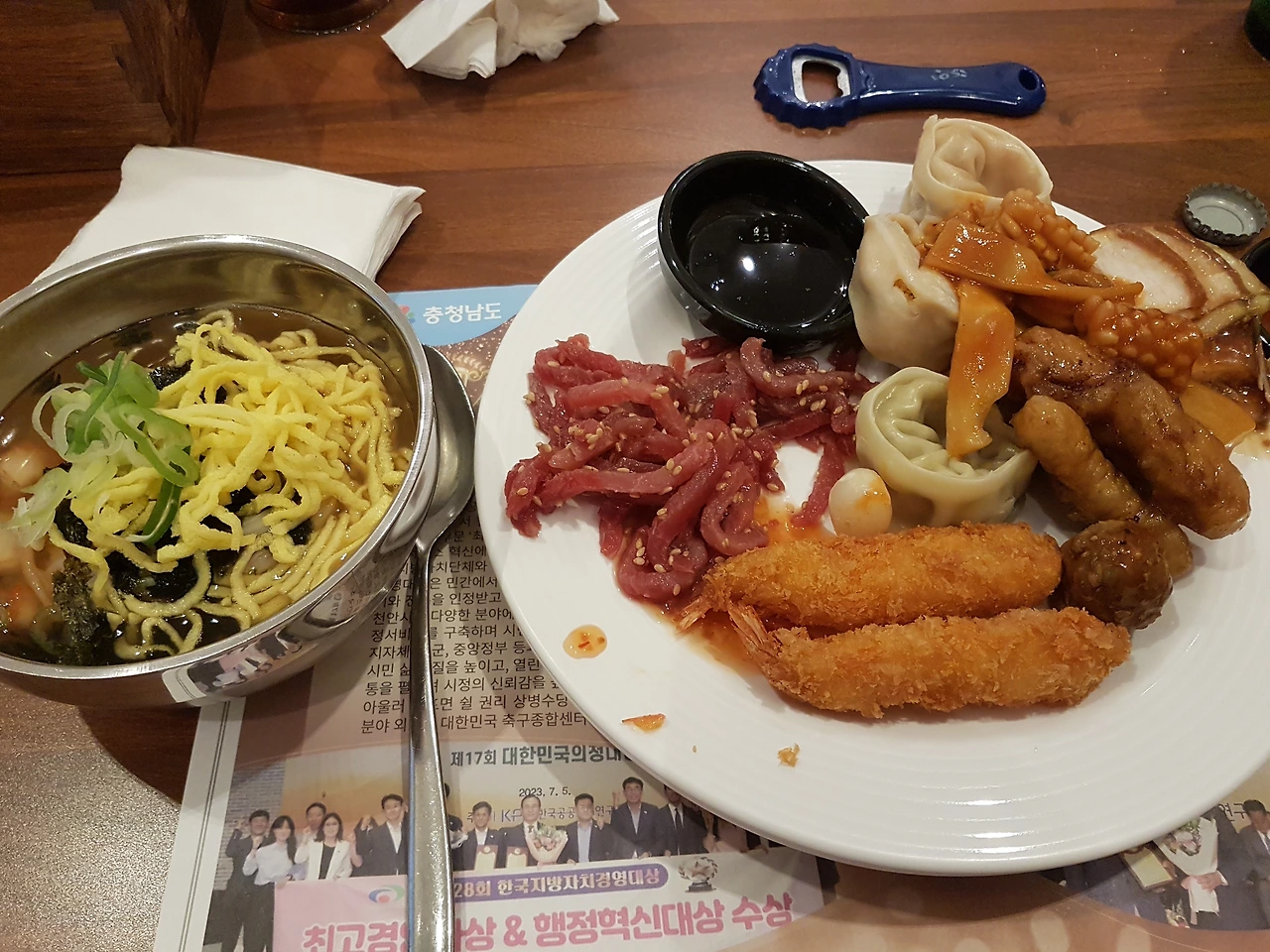 아마도 좋아하는 것만 고르는 이런 식사 장소에서는 접시만 보아도 단번에 식성이 나오는 것 같다. 역시나 고기와 면이 주류인데, 과거에 결혼식에 국수를 줬던 것 때문에 행사에는 역시 잔치국수가 빠지면 서운 한 것 같다. 많은 사람들이 축하하는 자리에서 대접할 것이 국수만 한 것도 없었을 것이다. 평범했지만, 그토록 타인을 축하해 주던 주변이 많았다는 것 같은데 고가의 식권에 초대하는 사람이나 그걸 받는 사람도 부담스러워지는 이 시절은 과거의 순수했던 축하와는 좀 거리가 멀어지는 것 같았다.