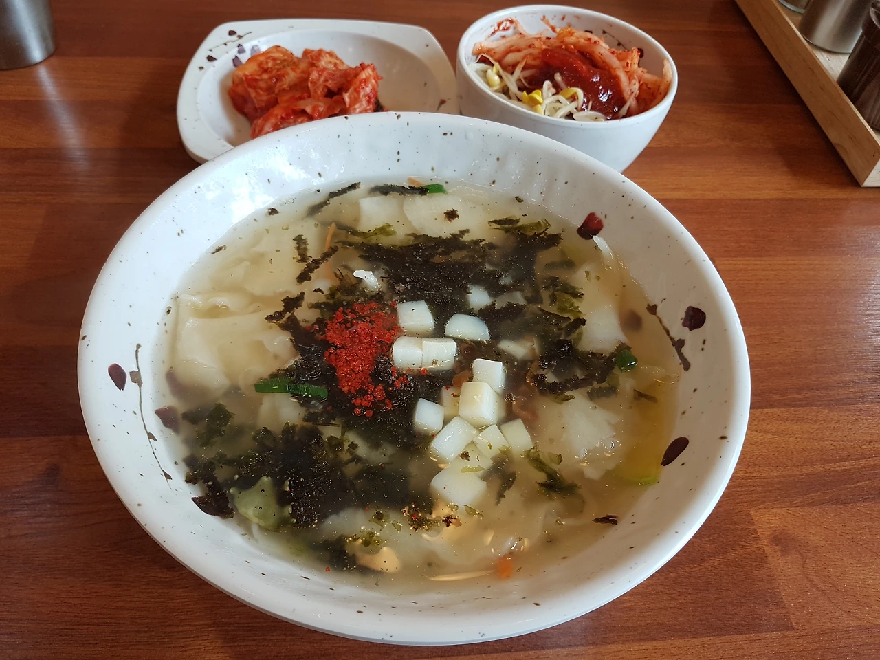 수제비는 흡사 국수 같았다. 깍두기 같은 감자에 김가루, 또 고춧가루. 야들야들한 수제비 반죽에 일단은 국물은 떠먹었다. 확실히 국수가 생각났다. 이대로 소면을 넣었다 해도 맛나게 먹었을 것 같았지만, 나의 기호를 더 반영하여서 청양고추와 양념장, 고춧가루를 더 넣었다. 좀 자극적인 맛을 좋아하는 분이라면, 얼큰 맛을 드시는 것도 좋을 것 같았다.