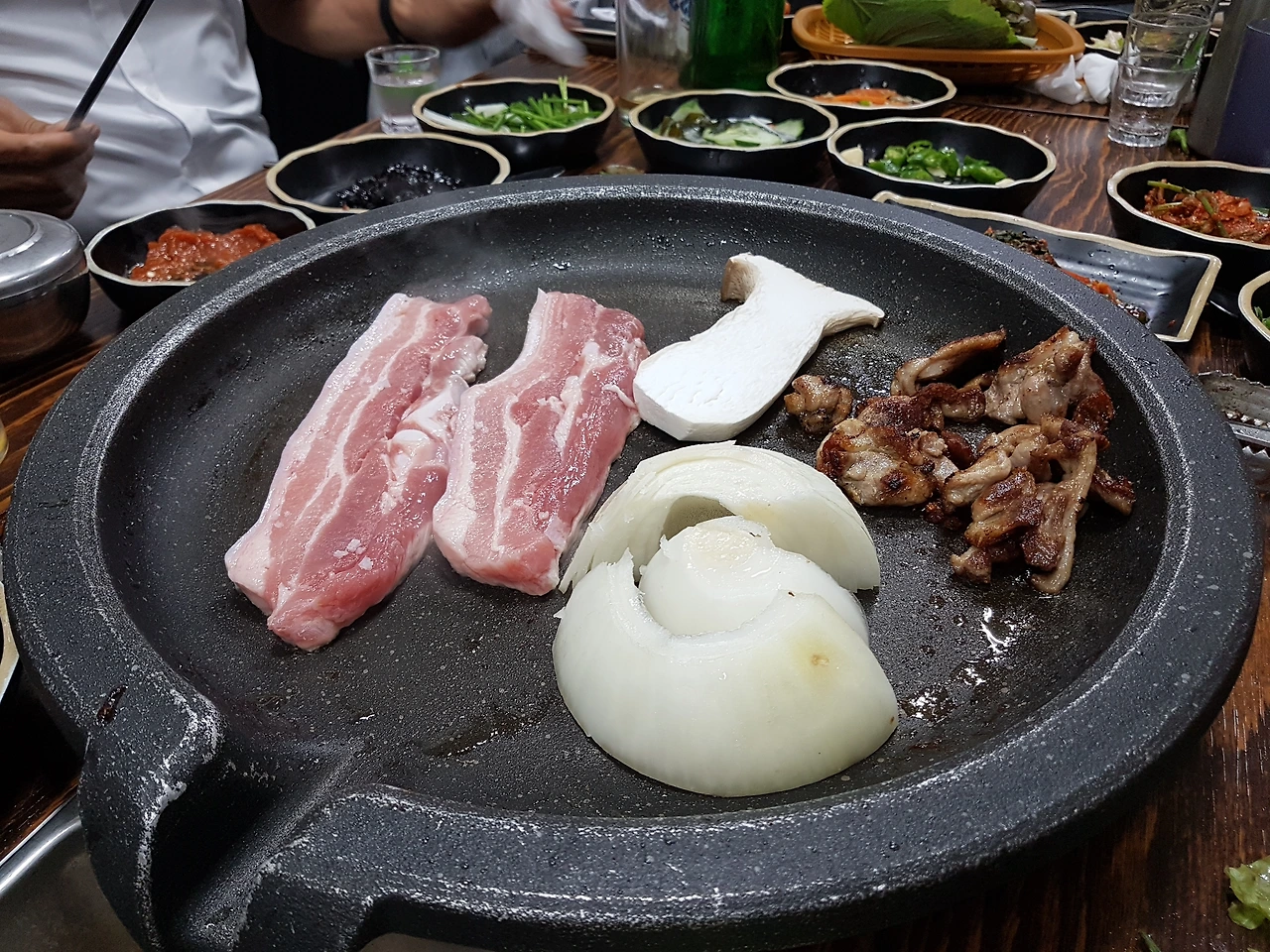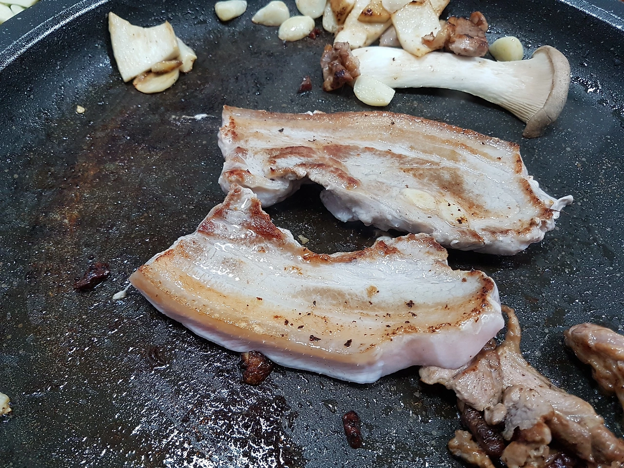 이날도 오리 고기에 한참 기름이 빠지는 모습을 굽다 찍다 먹다를 반복하다가, 후식 같은 삼겹살 일부를 굽고도 각 테이블에 볶음밥을 비볐다.