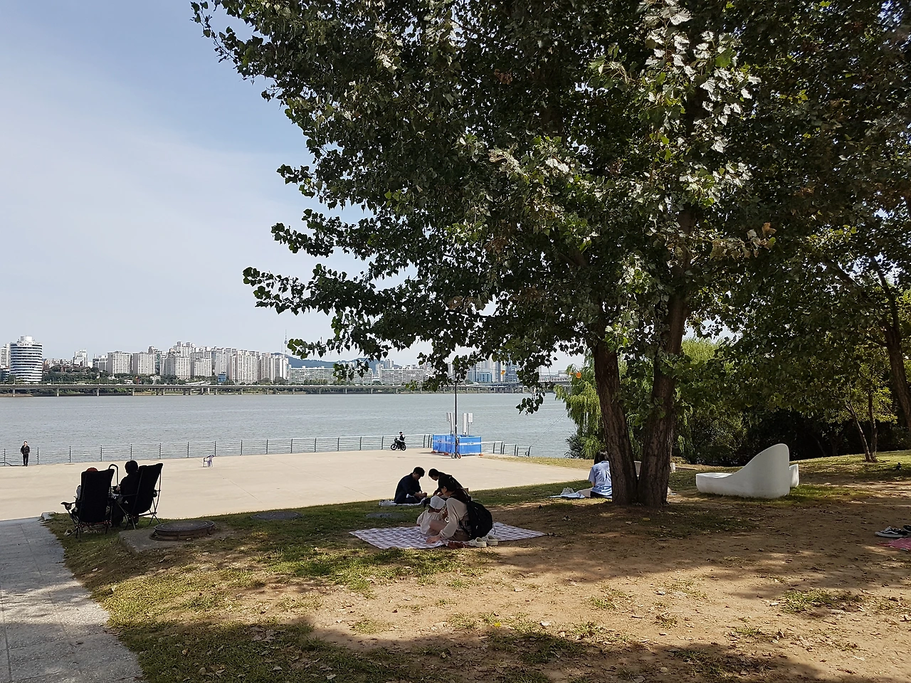 사람의 마음은 결국 날씨의 영향일까? 맛있는 라면을 먹고 난 후에 인심일까? 그런 우선순위를 논하기 무섭게 점심 이후에 그늘진 나무나 공터에는 사람들로 가득하다. 저마다 돗자리나 텐트를 쳐두고 휴식을 보내고 있다. 나도 빈 의자에 살짝 기대어 빌딩 숲 속에서 평온한 전원의 느낌을 받을 수 있어서 신기하다.