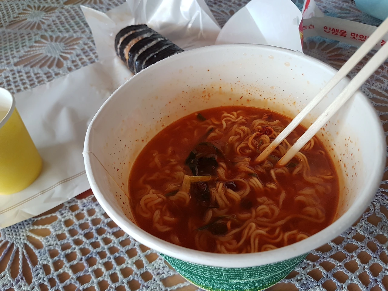 그럼에도 내가 편의점 컵라면을 사 와야 했던 이유는 이곳은 주말에 문을 여는 편의점도 없기 때문이다. 정말 외진 면 소재지라서 농협마트도 문을 열지 않는다. 그렇기에 항상 라면이다. 대부분은 자주 먹는 것뿐이라서 오늘 고른 라면에 기대가 생겼다.