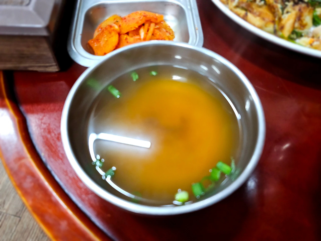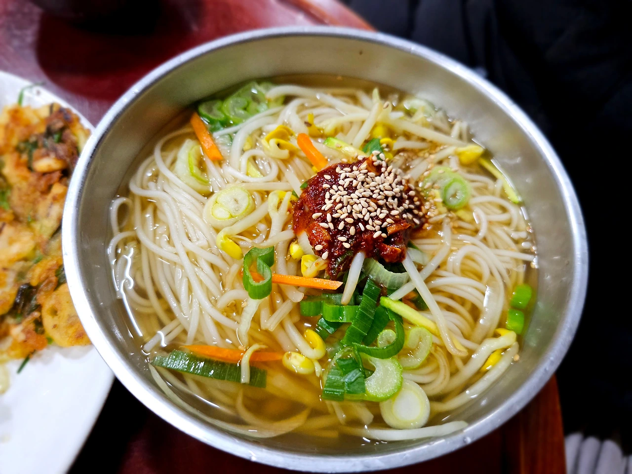 일단은 부침개를 시켰다. 해물파전은 쉽지 않은 선택에 중립적인 음식이라서 2인 이상은 역시나 필요한 주문이다. 바싹한 파전의 겉면과 야들한 야채와 해물들이 국수의 맛을 더 증가시켰다.