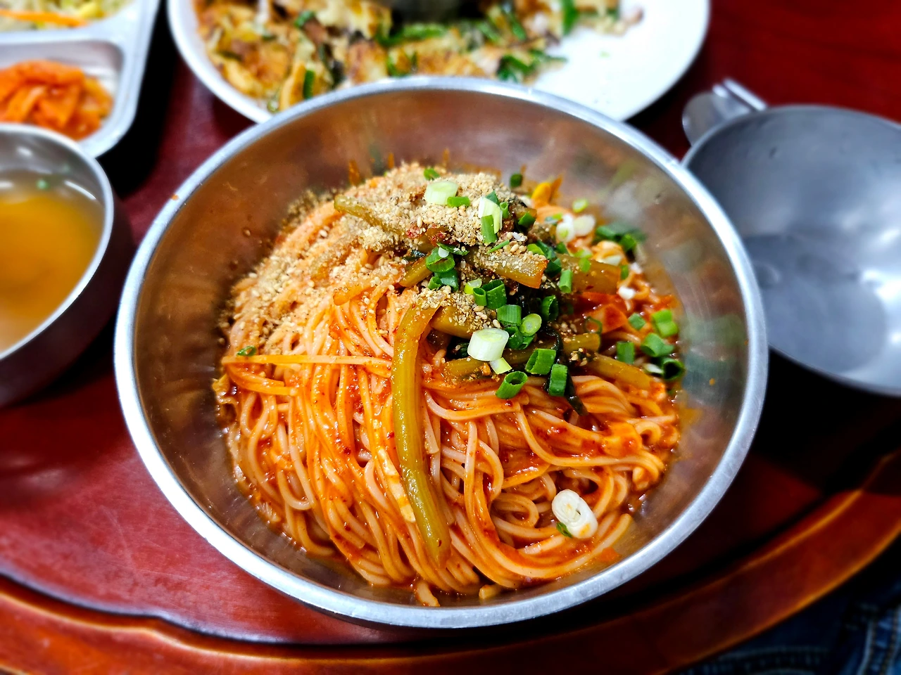 비빔을 시킨 것과 잔치국수를 시켰을 때는 사실 조금씩 덜어서 먹어볼 기회란 게 생긴다. 달콤한 붉은 비빔과 맑지만 깊은 맛이 느껴지는 잔치국수의 중립은 우리라는 개념이 아닐지.