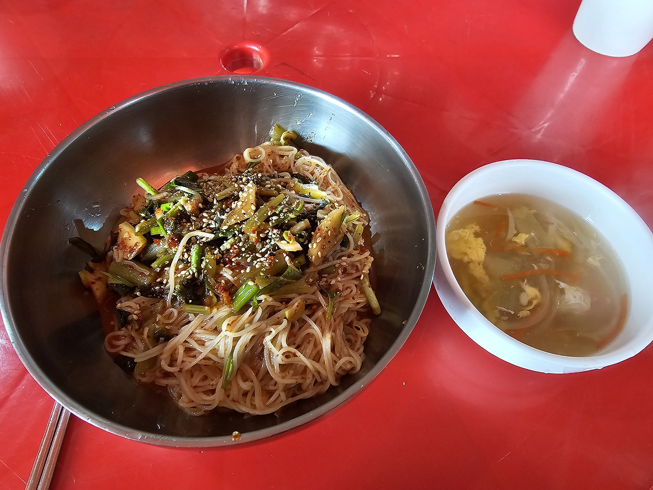 주인의 주방에서 뚝딱이는 소리와 잠시 고요한 적막이 흐르고서야 국수와 국물이 테이블 위에 올라왔다. 고추장이 맵다고 말을 해주었는데, 잘 읽은 김치가 올라간 매콤한 국수가 나왔다. 아마 집국수였다면 달달한 설탕도 들어가서 좋았을 것 같지만, 김치의 맛과 매운 고추장의 맛이 신선한 맛이었다. 게다가 그걸 중화시키는 국물은 한층 맛을 더 감칠맛 나게 했다. 얼얼 거리는 혓바닥을 다시금 한 젓가락 들어가는 국수로 그리고 국물은 한 모금 마시면서 몇 분 안 되는 먹방을 찍었다. 한마디로 어머니가 뚝딱 해주신 비빔국수 맛이었다.