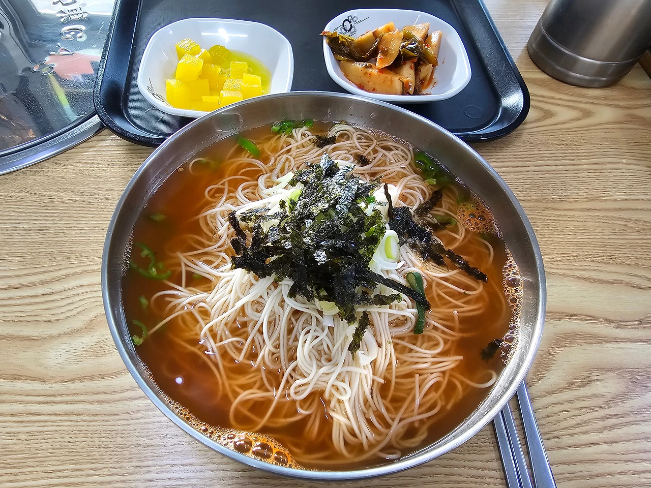 자주 가던 수제비집도 유명한 국숫집도 문은 닫아서 출출한 상황에서 보통은 지나쳤을 곳을 주차하고, 다양한 메뉴 중에서 얼큰 잔치국수를 하나 주문했다. 이곳에 사는 지인이 맛이 좋다고 했던 것 같았지만, 굳이 가지 않았던 곳에서 '얼큰'이라는 이름에 여러 국수의 모양을 상상했는데, 맑은 잔치국수에서 청양고추와 옅은 붉은 국물에서 시원함을 느낄 수 있는 정도의 맛이었다.