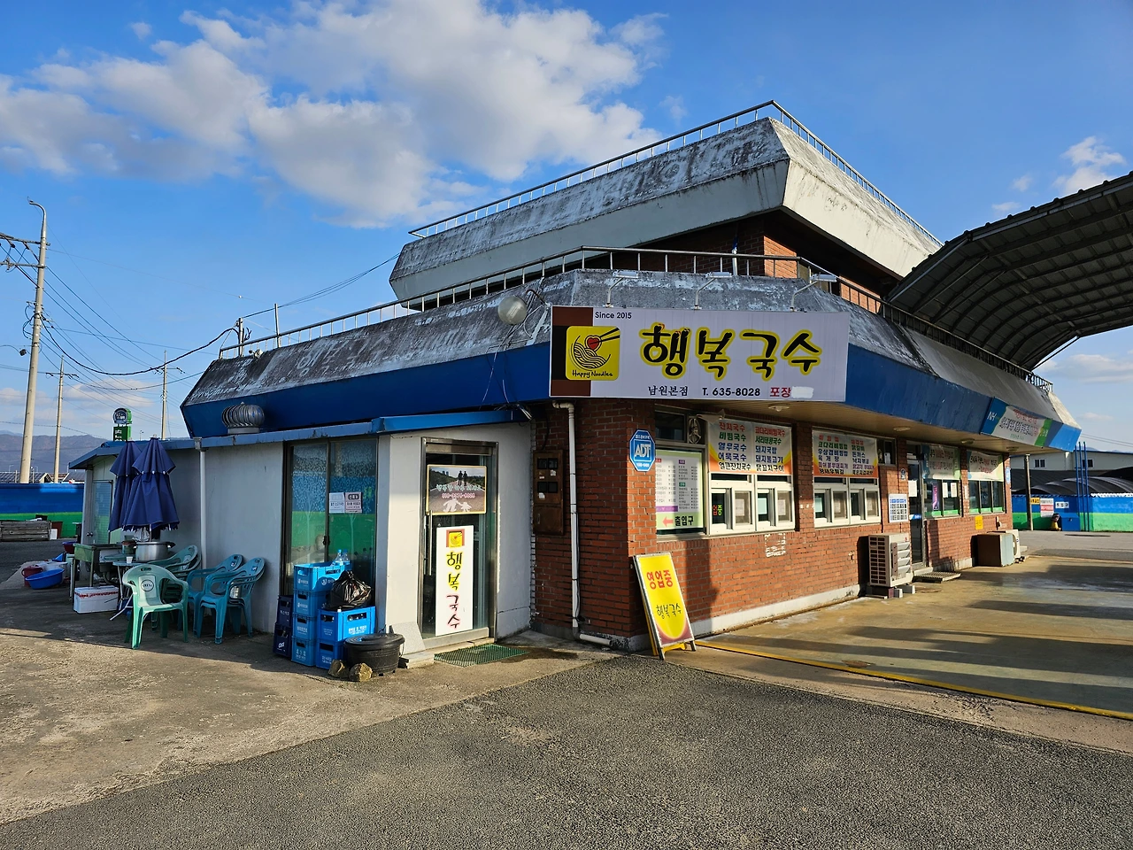 오늘 내가 갔던 국숫집도 그랬다. 출발지와 목적지를 이어주는 어느 시골도로를 따라서 가서도 결국은 잘 보이지 않는 주유소 한편에 자리한 행복국수.