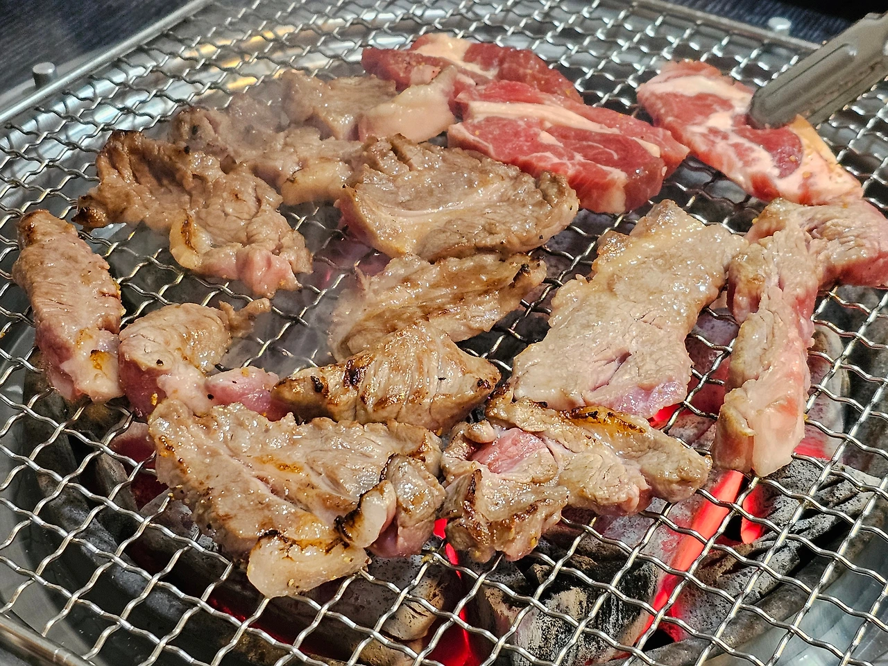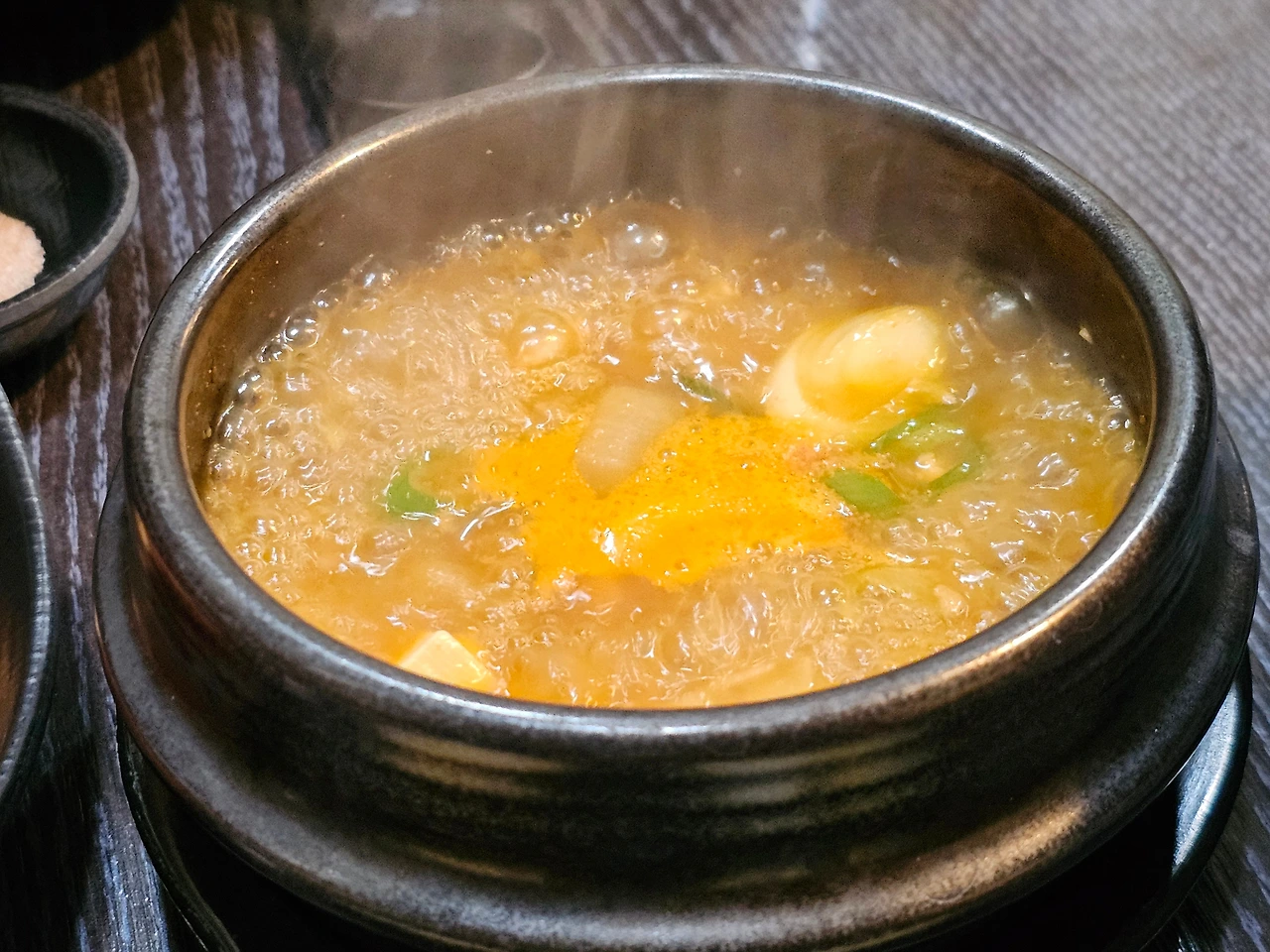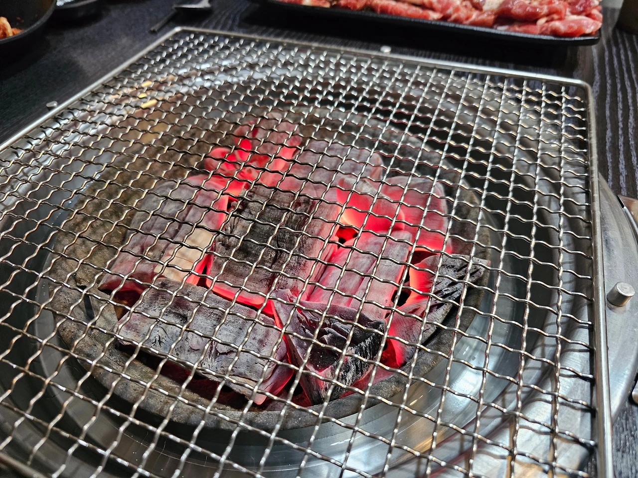 이번 메뉴는 양고기였다. 보통의 양꼬치를 생각했는데, 화로에 굽는 양갈비 종류였다. 잘 손질된 숙성 고기가 보기에도 먹음직스럽다. 그래도 술 한 잔에는 불판에 올라온 고기로는 당장 짠을 외칠 수 없으니, 찌개로 소주병을 개시한다.