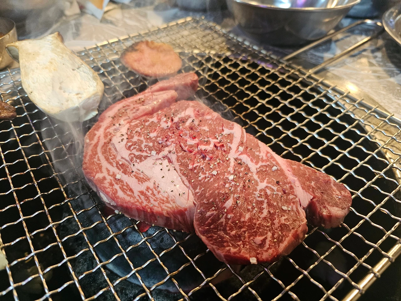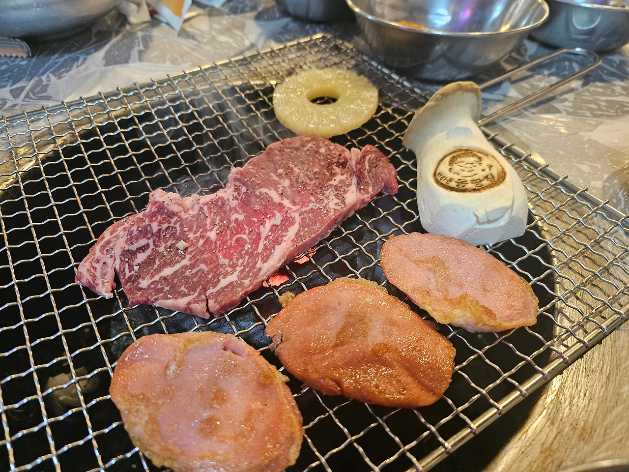 가끔 정말 고기가 먹고 싶을 때. 슬쩍 와서 차려진 기본상에 돼지고기 3인분 정도 주문하고는 공깃밥에 쓱싹 끼니를 해결했던 <옹팡집>에서 평소와 다른 메뉴를 주문해 봤다. 돼지고기 부위가 아니라, 한우 부위를 연탄불 위에서 조심히 구웠다.