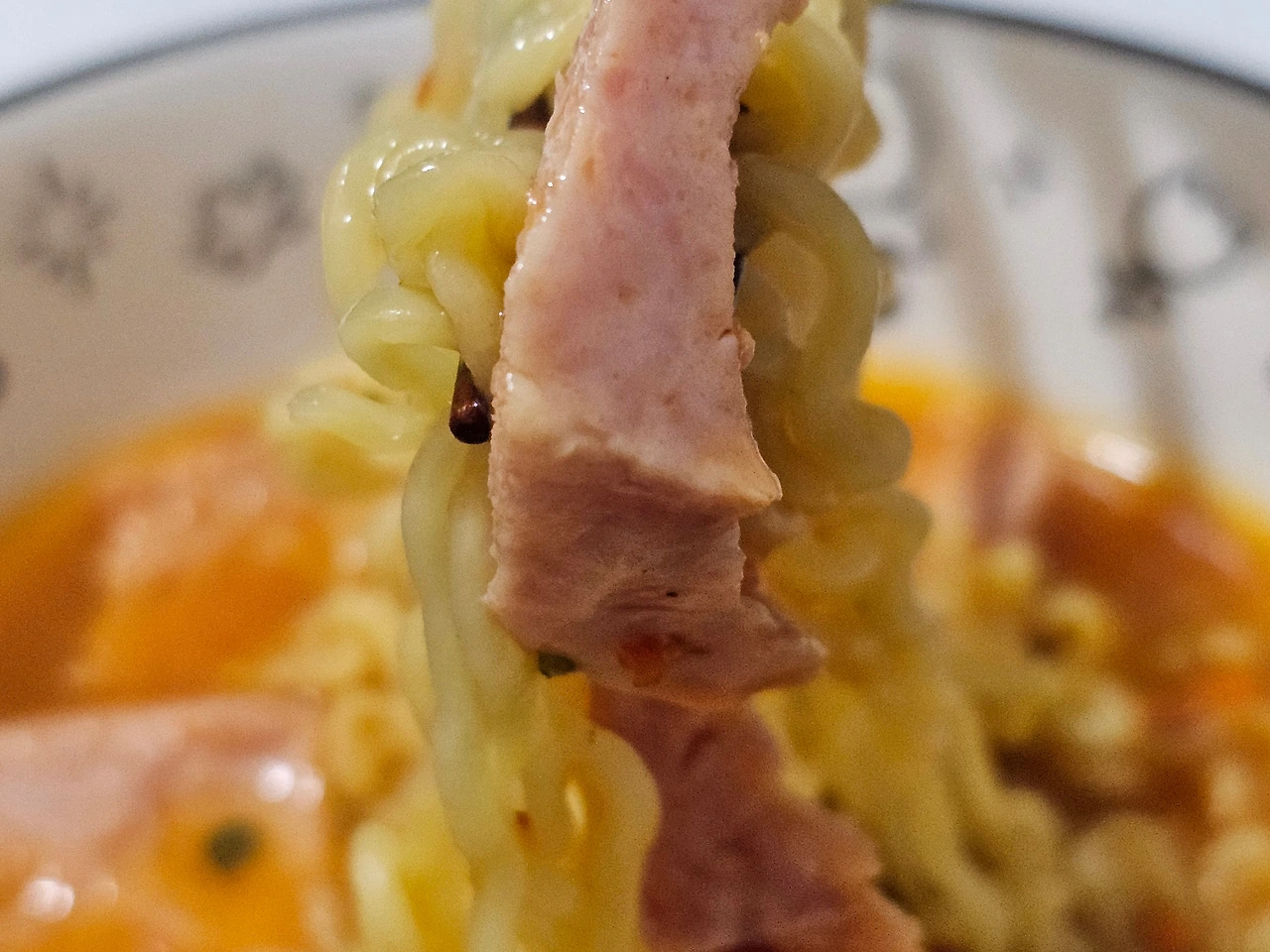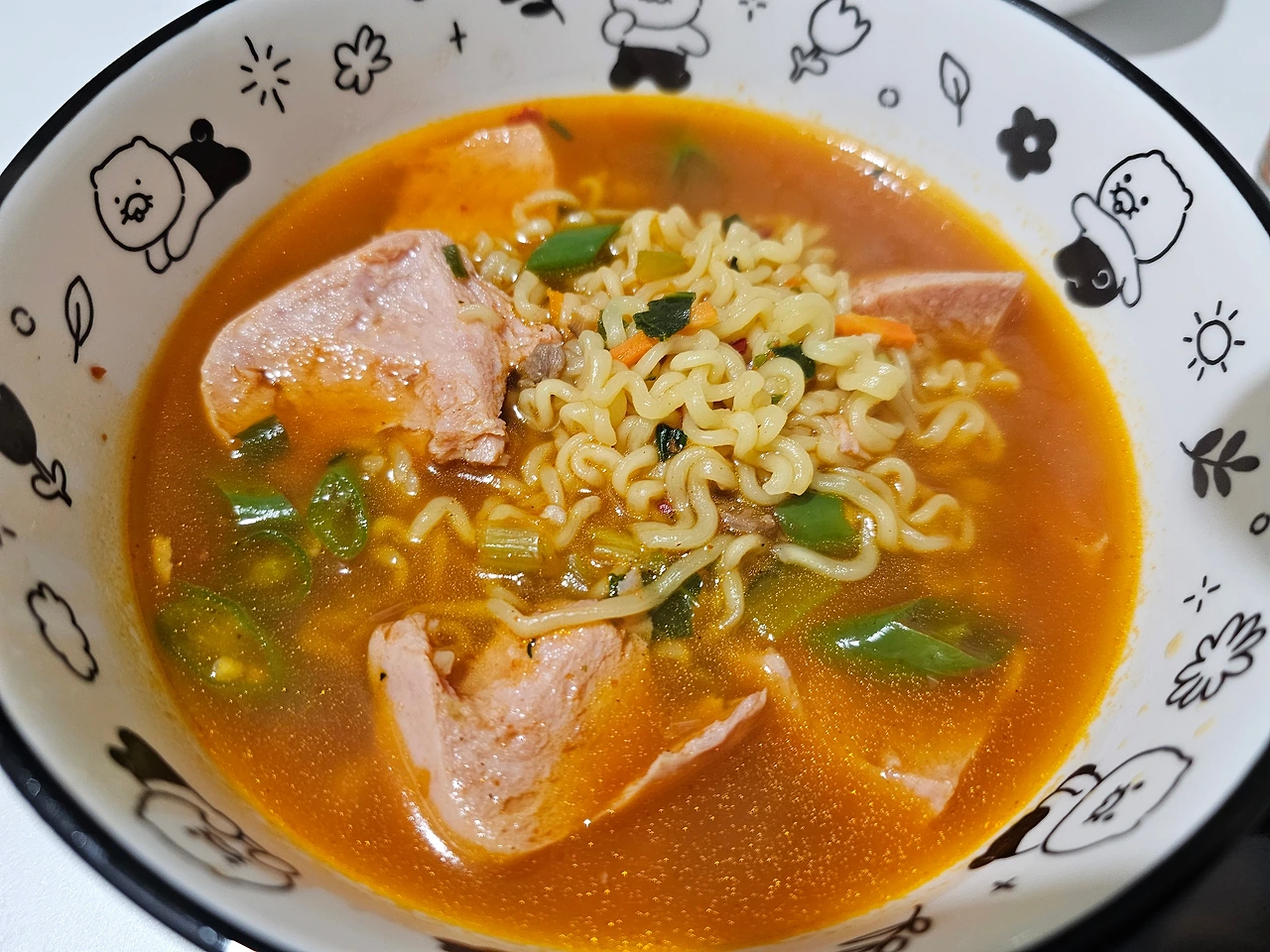 결국에는 얼큰한 국물이 생각나서 500ml 물을 냄비에 넣고, 기포가 올라오는 뜨거운 순간에 면과 수프를 넣었다. 거기에 매운 고추 두 개를 썰어서 넣고는 고춧가루 한 스푼을 더 넣었다. 매울 것 같아서 스팸을 숟가락으로 듬성듬성 떠서 마무리를 했다.