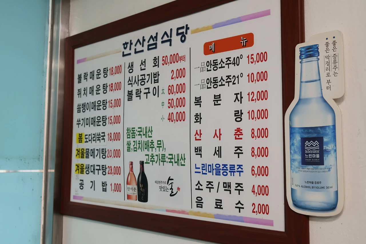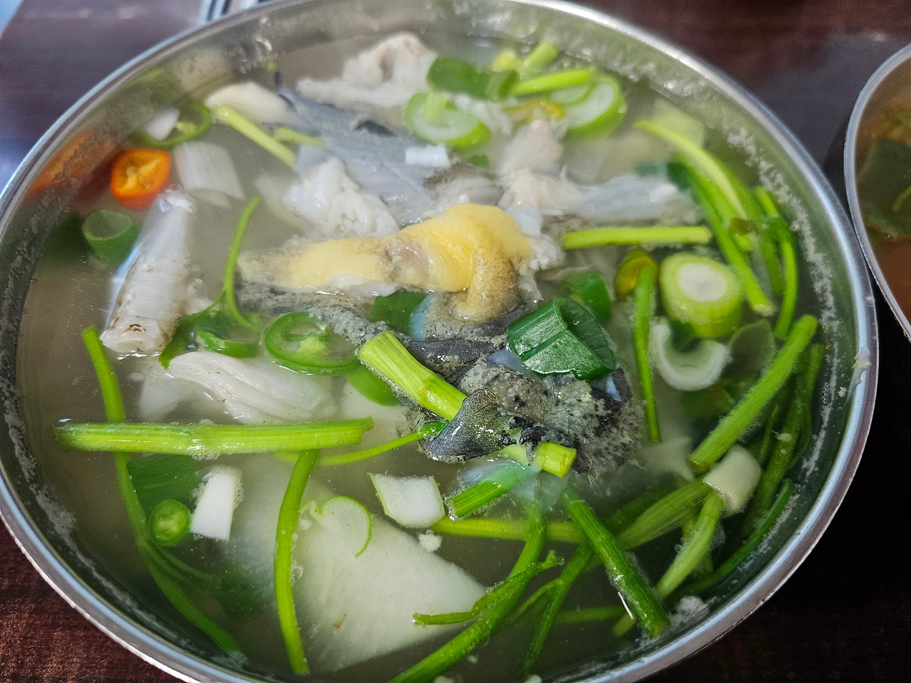 인터넷 검색을 해서 물메기탕이 유명하다는 '한삼섬식당'에서 바로 주문을 했다. 점심시간의 거의 끝무렵에 도착했지만, 식당에서 각 테이블에서는 시원한 국물을 각자 놓고는 소주잔을 기울이는 모습이 인상적이었는데, 맛이 좋다는 볼락구이는 이미 품절이 되어버려서 다들 물메기탕 아니면 볼락매운탕을 주문하는 손님이 이어졌다.