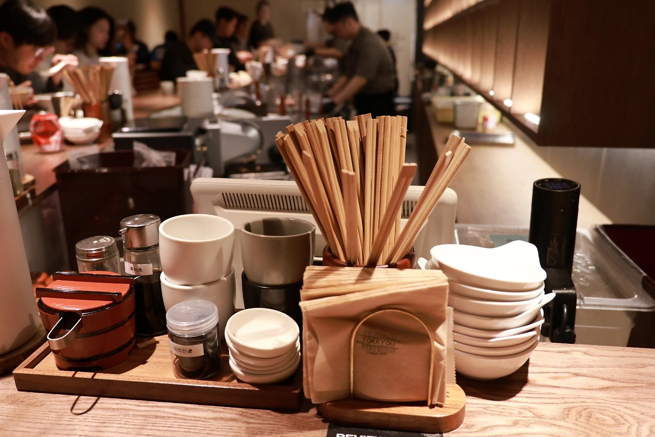 감성 있는 나무젓가락과 식기와 테이블. 주문한 각자의 메뉴가 나오는 모습이 바로 보였기에 신기했다. 소유라멘과 바지락라멘, 탄탄멘이 주방에서 만들어지고 있었다.
