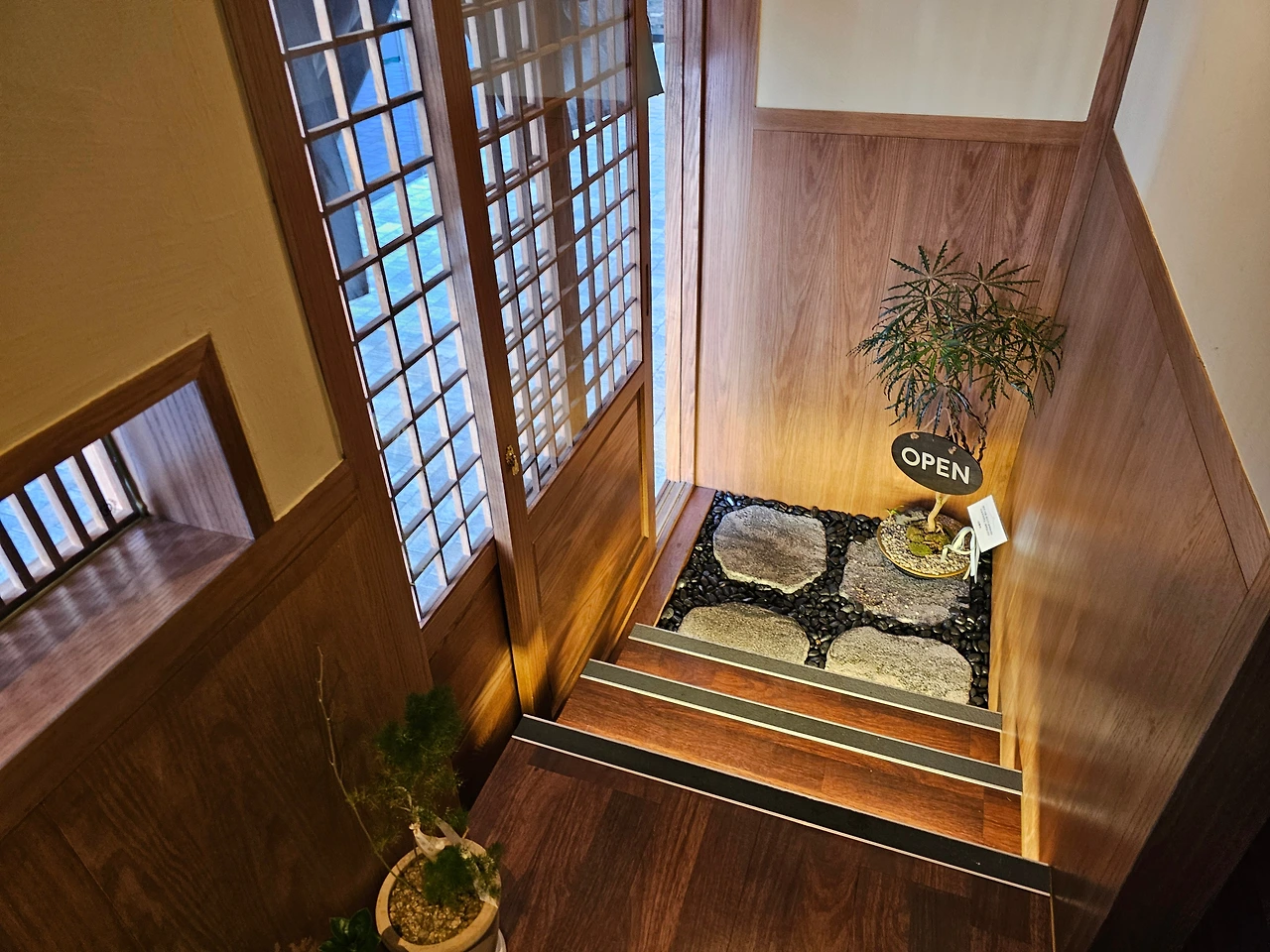 커다란 건물 사이로 통로에 산뜻한 문이 보였다. 뭔가 이 세계로 이어질 것 같은 미닫이 문. 입구부터 라멘집이라는 광고. 그리고 문을 열고 들어간 계단은 감성 터지는 아기자기함이 있었다.