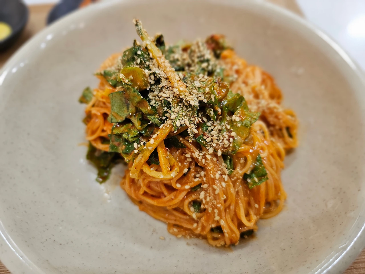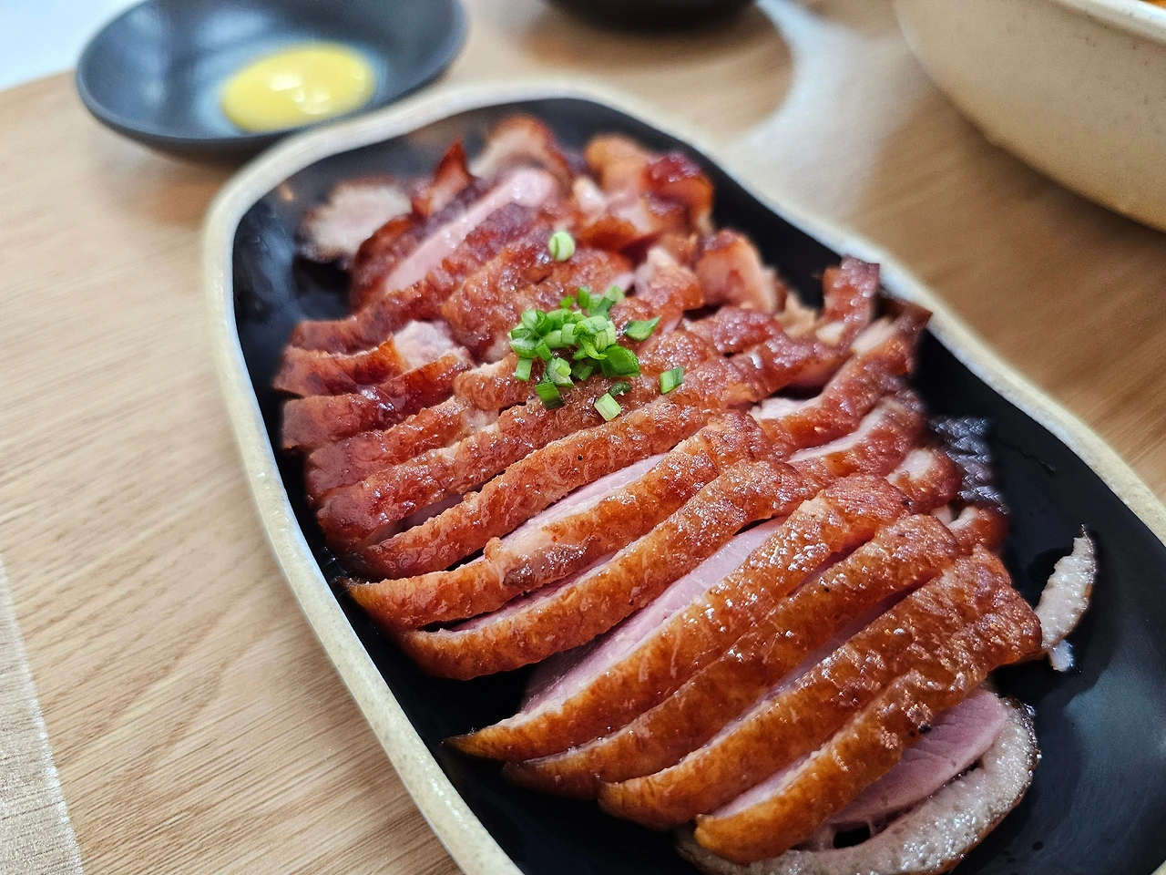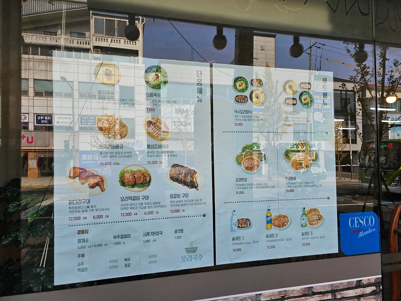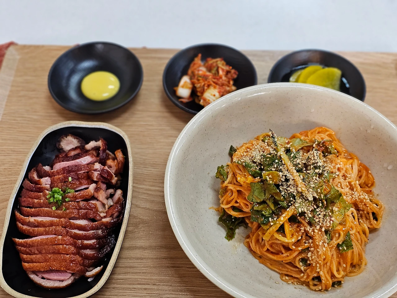 미소가 온화한 사장님이 계셨고, 모두들 국수에 고기 한 점을 먹고 있어서 나도 같은 것을 시켰다. 입이 바싹 마른 상태로 버스까지 탄 상태였기에 느끼한 속을 바로 잡으려고 비빔국수를 주문했다. 그리고 보기에도 바삭한 식감의 오리구이가 나오는 세트 메뉴였다.