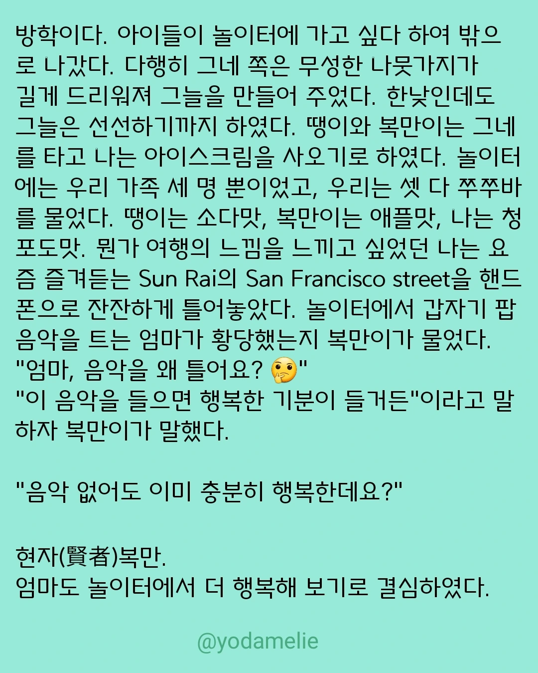 아이들은 놀이터에서 이미 너무 행복하다. 아이들에게는 놀이터가 샌프란시스코였다. 하지만 안타깝게도 엄마에게는 놀이터가 고역이다. 혹자는 아이들이 노는 것만 봐도 뿌듯하고 행복해야 하는 것 아니냐고 할 지도 모르겠지만 솔직히 놀이터는 어른들이 행복하기 힘든 공간이다. 어른을 위한 놀이가 없으며, 스마트폰을 보며 다른 볼 일을 보면 아이에게 관심을 안 갖는 것 같아 뭔가 미안하다. 아이들과 같이 놀아주거나 위험하지는 않은지 쉬지 않고 체크 한다. 절대로 놀이터에서 엄마는 자유로울 수 없는 것이다. 아는 엄마를 만나면 웃으며 대화를 이어가고 아이들끼리도 잘 어울릴 수 있도록 신경을 써야 한다. 이 모든 게 별 노력없이 자연스럽게 진행되는 것 같지만 적지 않은 긴장감과 의무감이 있으며, 가장 큰 문제는 엄마의 마음에 샌프란시스코 스트릿이 흐르고 있다는 것. 엄마도 엄마대로 놀고 싶고 쉬고 싶고 자유롭게 뛰어놀고 싶다는 것, 그리고 세탁기에는 아직 꺼내지 못한 빨래가 있고, 마트에서 사와야 하는 쇼핑목록이 있고, 저녁 메뉴 준비는 커녕 아직 쌀도 불리지 못했고, 아이들이 계속 미루고 있는 방학숙제가 나의 숙제처럼 쌓여있다는 것이다. 놀이터에서 놀지 못하는 어른들은 오늘도 해야 할 일, 하고 싶은 일을 뭉게뭉게 키워가며 아이들을 보고 있다.