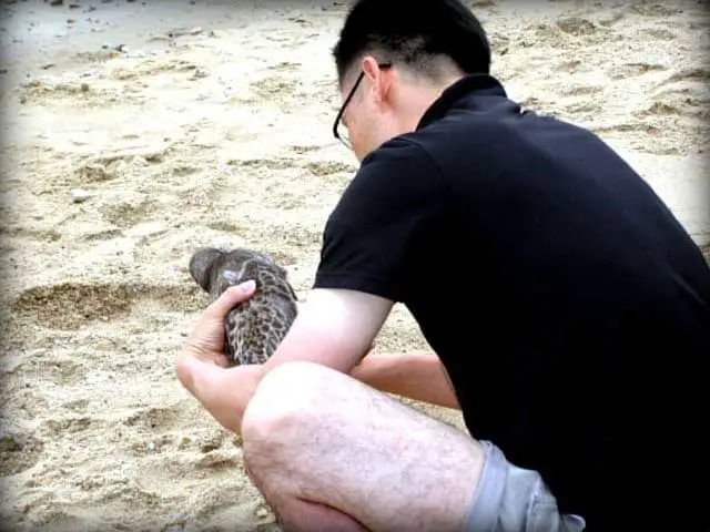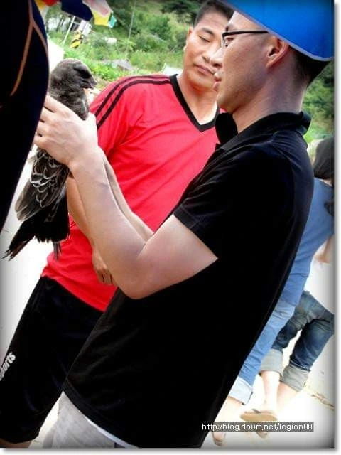 아마도 그 무게 때문에 부리가 잘려나간 걸로 보였습니다. 어떻게든 도와주고 싶어서, (잡아보려고) 새우깡으로 살살 꼬셔 보았습니다. 20여분의 숨바꼭질 끝에 결국 잡는 데는 성공을 했지요. 먼저 납돌을 제거하고 해양경찰 아저씨들에게 목구멍에 걸린 낚시바늘 제거를 부탁드렸습니다. 얼마나 굶었던 걸까요... 허겁지겁 새우깡 조각들에 달려들어 쪼아대긴 하지만 그거 하나 집어올리기가 좀처럼 쉽지가 않았습니다.