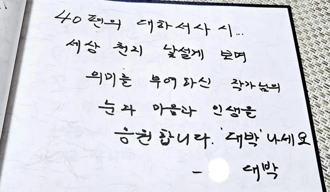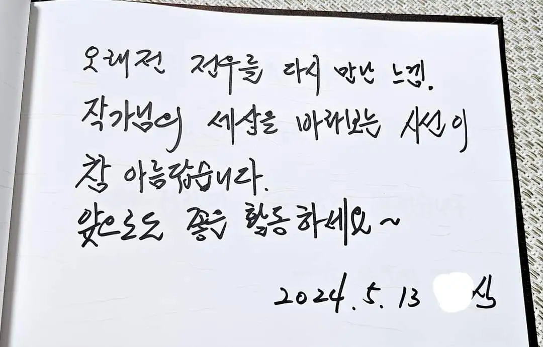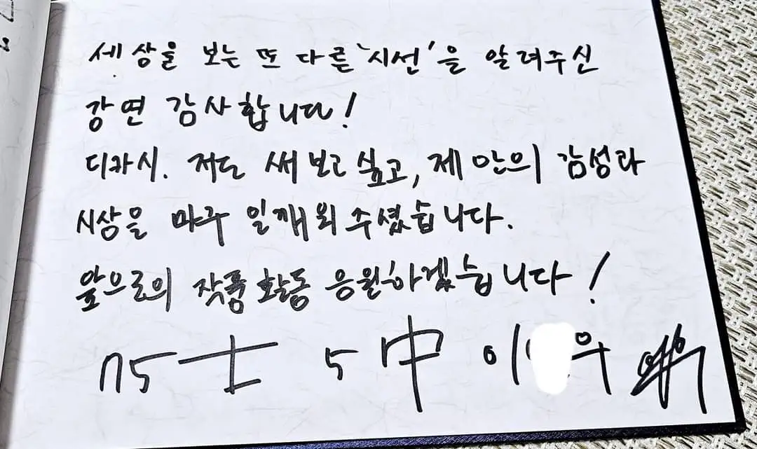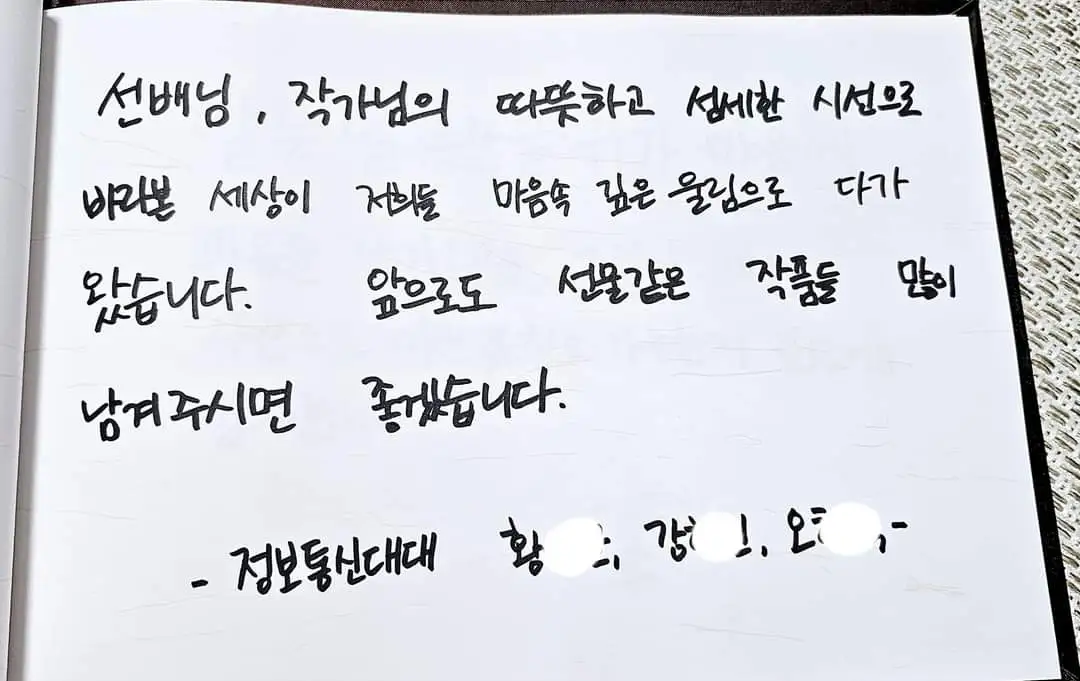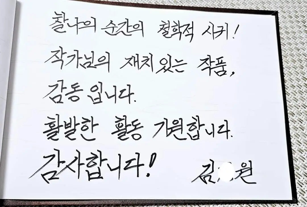 공군사관학교 학술정보원에서 2개월 간의 디카시 전시회를 마치고 액자 40점과 방명록, 화분들을 철수했다. 그동안 많은 전시회를 했지만 이렇게 방명록을 3개나 소모한 건 처음이라는 담당자분의 말을 들으니 새삼 다녀간 분들께 더욱 감사한 마음이 든다. 4월 17일 디카시 강연 때도 자리가 모자랄 정도로 객석을 꽉 채운 사관생도, 장병, 군무원분들을 보며 적잖이 감동했었다. 집에 가져온 방명록을 하나둘 펼쳐보면서, 디카시도 언젠가는 예술로서 인정받을 수 있을 것 같은 가능성을 보았다.