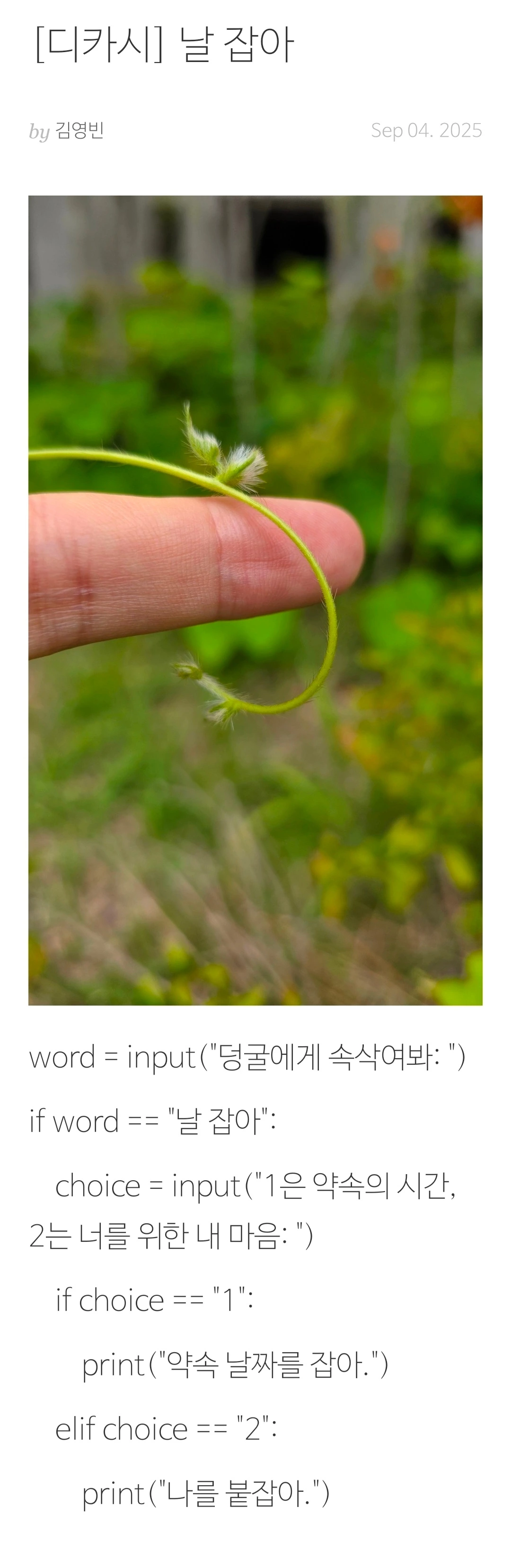 손가락 위에 걸린 작은 덩굴 하나, 그리고 (컴퓨터 프로그래밍 언어인 Python)코드 형식의 짧은 문장.