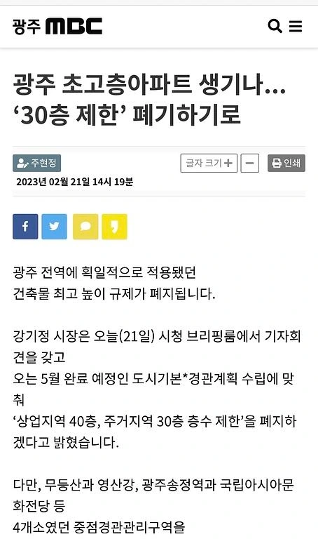 광주의 스카이라인을 낮게 유지할 수 있었던 것은 그동안 시가 건물 층수를 규제해 왔기 때문이다. 광주는 광역시 규모에 비해 개발이 덜 된 도시다. 공단도 적고 기업도 많지 않다. 게다가 지속적으로 인구가 감소하고 있는 지역이라 고층 건물의 수요가 많지 않다. 건물들이 높아야 할 이유도 조밀하게 모여있어야 할 이유도 없다.