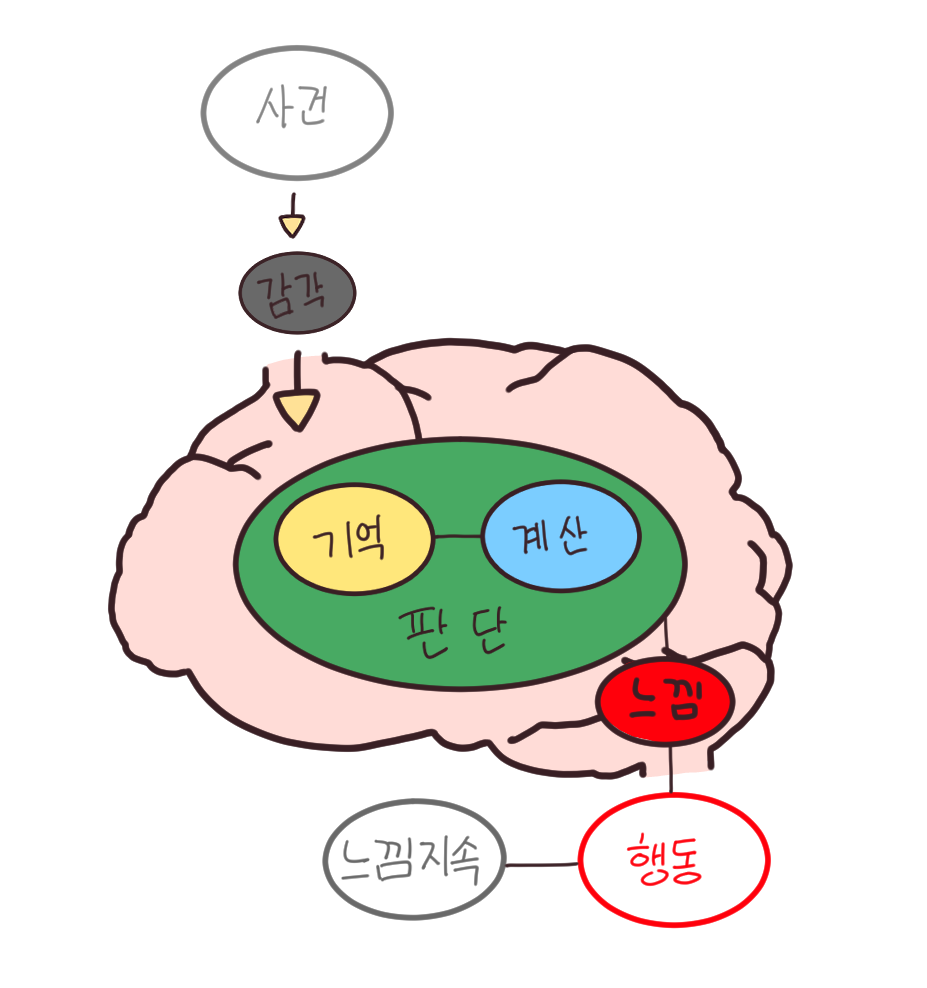 사건->감각->판단(기억+계산)-(느낌)-행동-느낌