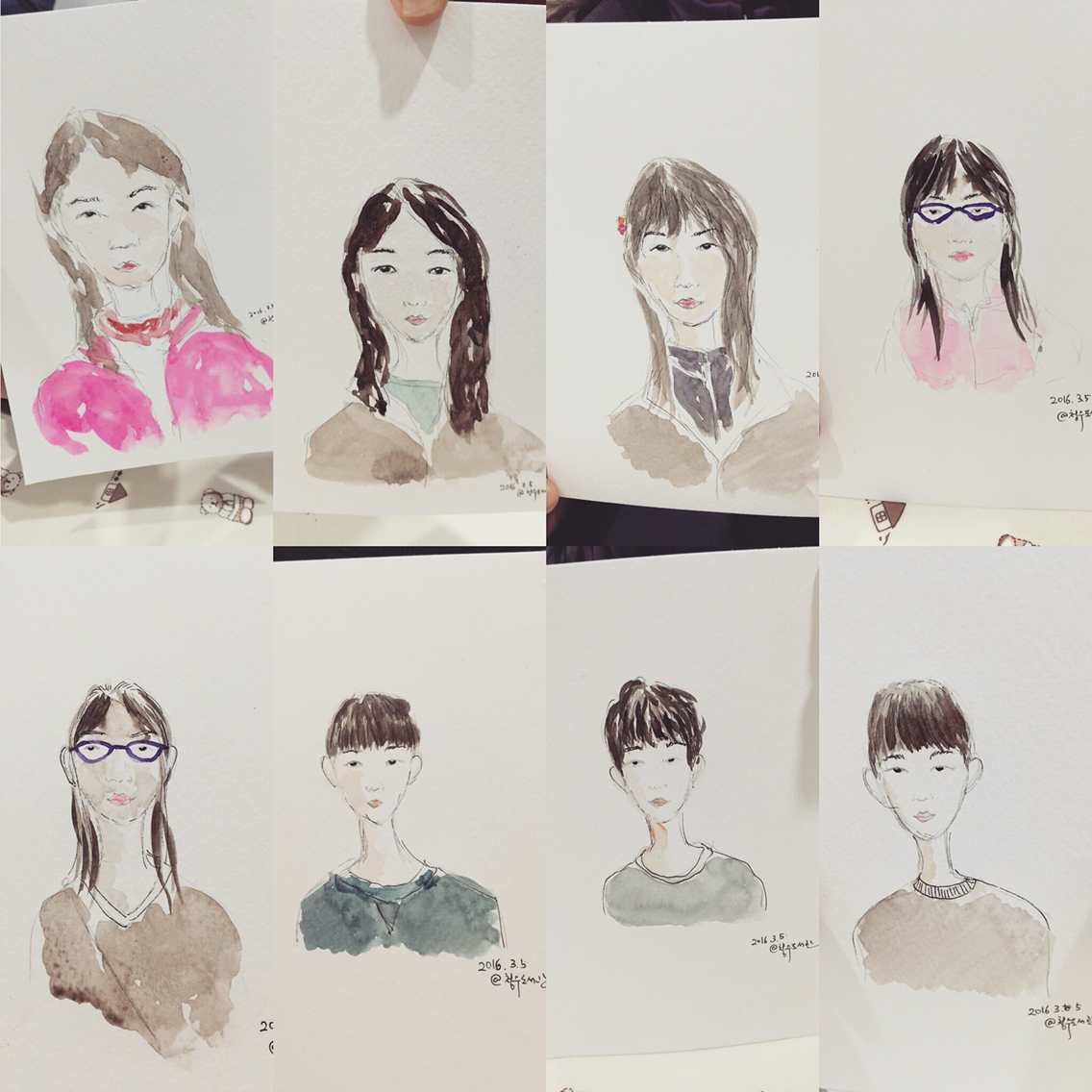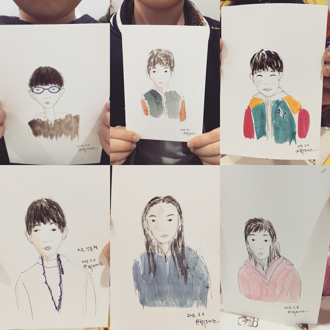 캐리커쳐 그리기는 초등학생이 대상이었다. 현장접수를 받고 두 시간 동안 무려 14명! 섬세하게 스케치하고 채색하고 마무리하지 못해서 죄송하고 아쉬운 마음이었다. 또한 수채물감, 팔레트, 물통 등 수채화로 그리는 것은 이번이 처음이었다. 부족한 실력임에도 동네주민들, 아이들의칭찬과 주고 받은 웃음은 커다란 선물이 되었다.