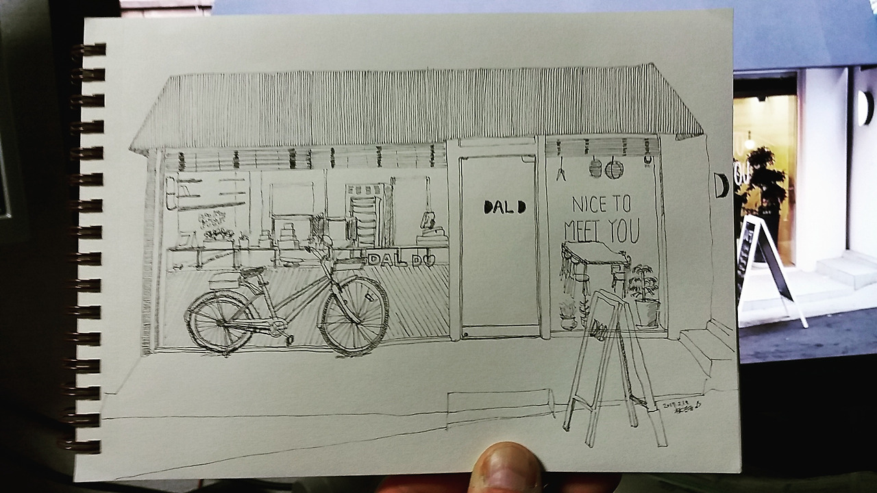 '달디'의 자전거는 오랜만에 보았지만 인상적이었다. 좌우로 넓게 펼쳐진 천막도 인상적이었다. 작은 스케치북을 폈다. 자전거를 그리고 가게 유리창을 그렸다. 지붕을 넣고 위 아래로 선으로 채웠다. 이렇게 단순한 작업은 마음을 가다듬는 효과가 분명 있다.