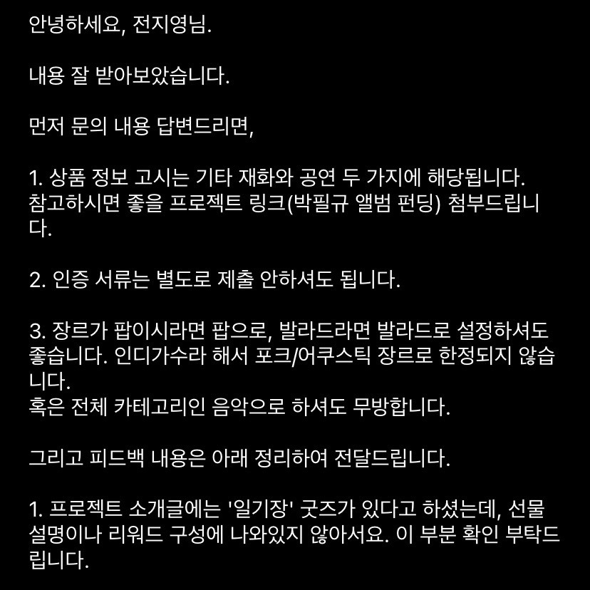 이 과정 속에서 나는 텀블벅이 창작자를 진심으로 지원한다고 느꼈다. 레퍼런스 링크부터 리워드에 대한 조언까지, 보다 나은 펀딩을 위해 함께 고민해주는 모습에 감동받았다. 그러니 누군가 문의하기를 주저하고 있다면 용기 내어 메일을 보내보는 것을 추천한다. 아래는 우리가 앨범 펀딩을 준비하며 담당자 분과 나눈 메일의 일부다. 혹시 앨범 펀딩에 같은 의문을 가지고 있었다면 아래 내용을 참고해보자.